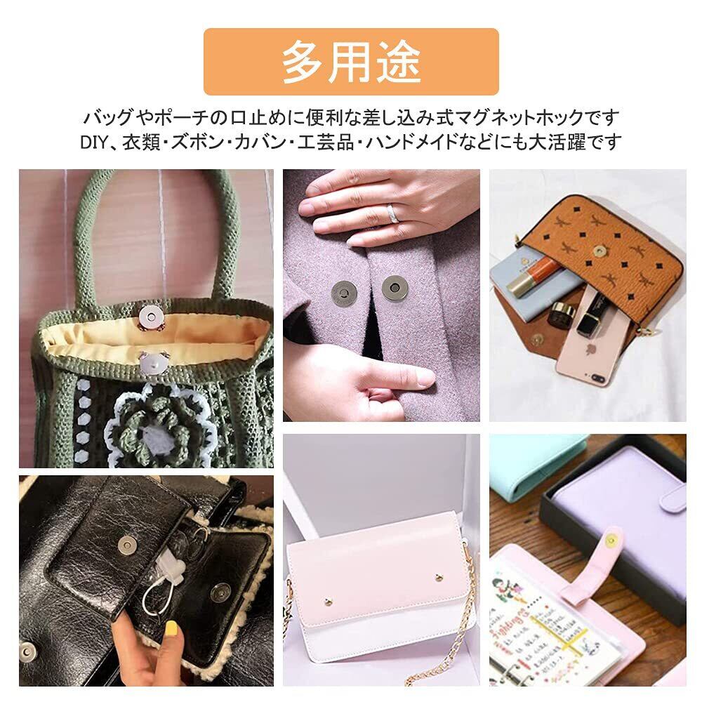 【多用途】バッグやポーチの口止めに便利な差し込み式マグネットホックです。マグネットは超強力、重い荷物を入れても、大きなバックにもご使用いただけます。DIY、衣類・ズボン・カバン・工芸品・ハンドメイドなどにも大活躍です。