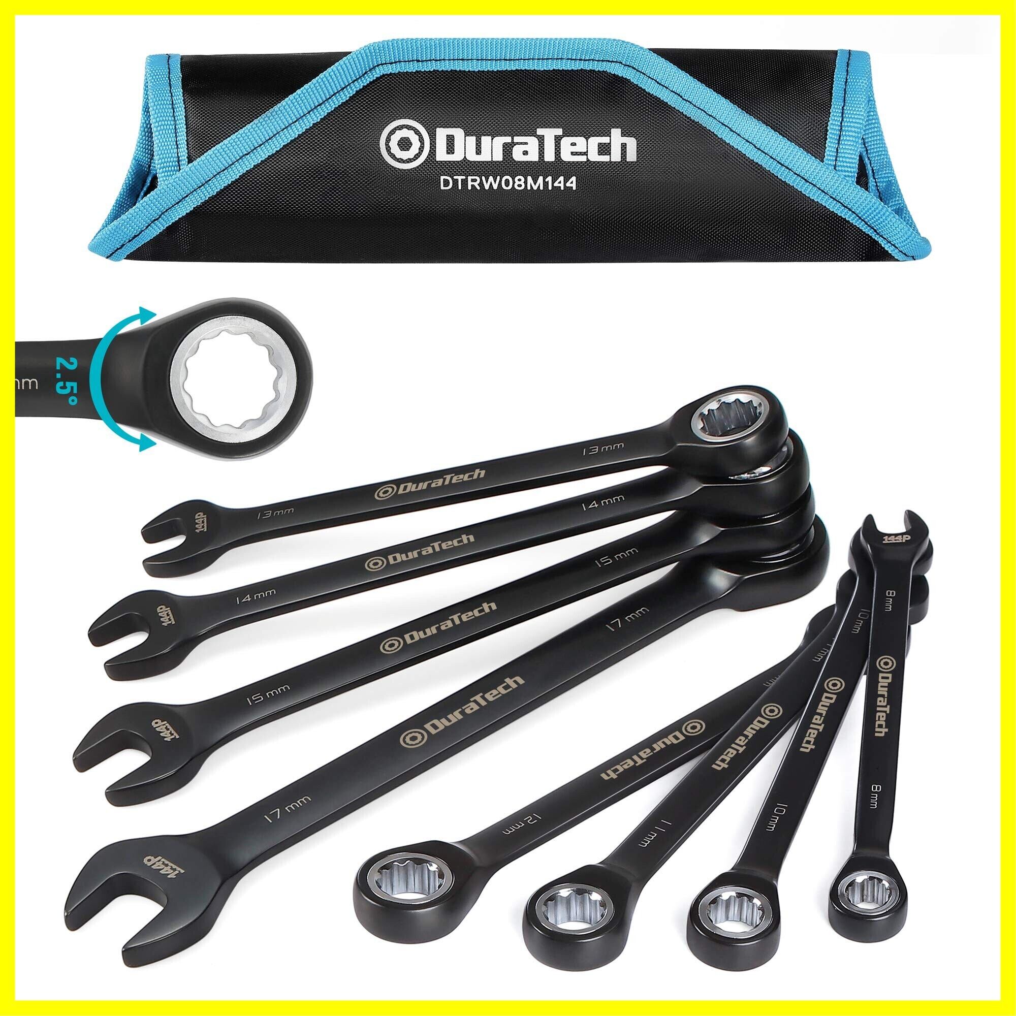 DURATECH コンビネーションレンチ ラチェットレンチセット 板ラチェット スパナ 144ギア 8~17mm CR-V製 黒クロムメッキ済 組み立て DIY 収納袋付 8本組