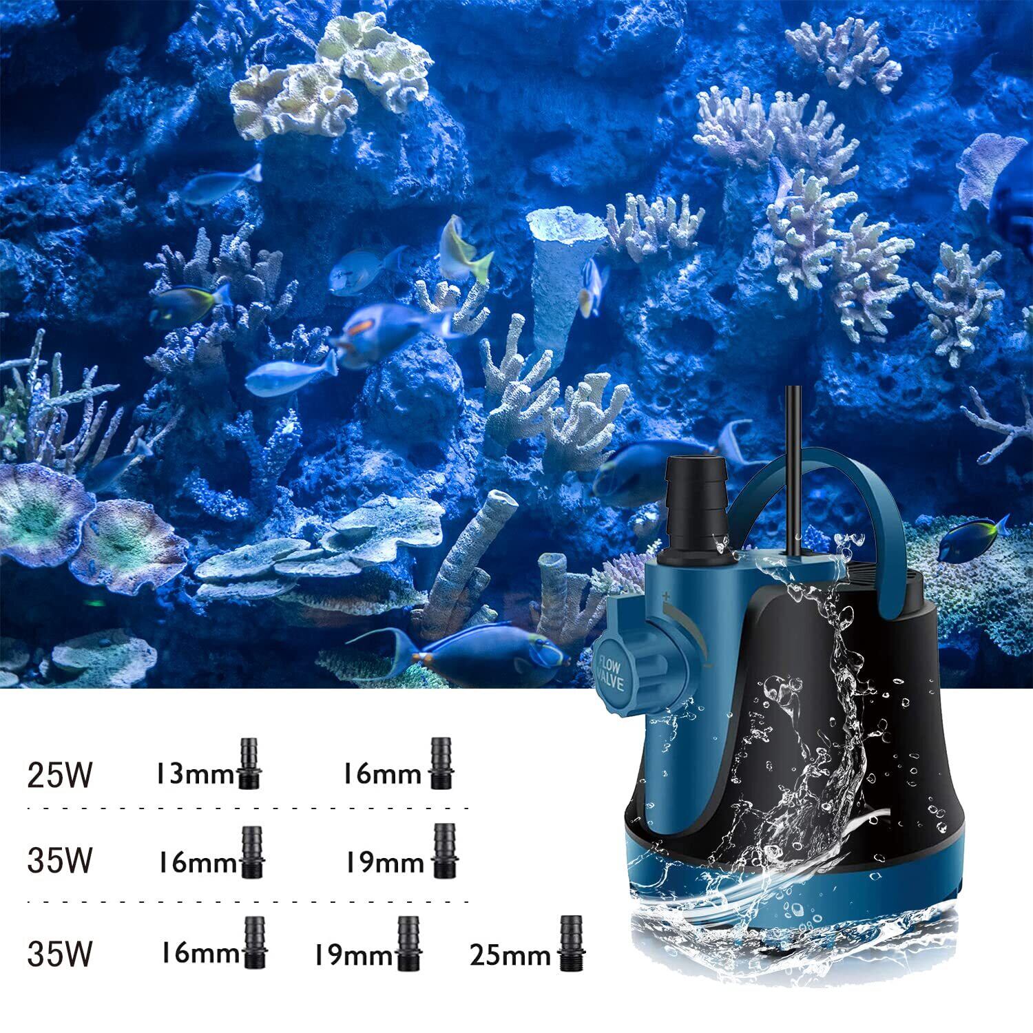 【商品仕様】・入力電圧:AC 100V ・周波数:60Hz ・電力:25W ・最大流量:1500L/H ・最大揚程:1.8Mぐらい ・ノズルサイズ:13mm&16mm ・騒音クラス:40デシベル以下 ・電源コードの長さ:1.9M