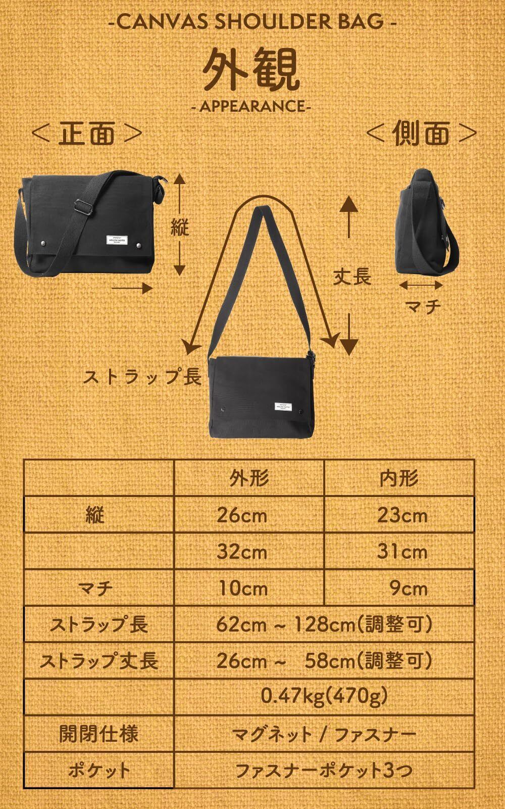 【素材】コットンキャンバス(綿・帆布) 裏地:ポリエステル 自然素材のコットンキャンバスは厚手の質感と手触りが心地良いショルダーバッグ。伝統的な配達カバンの原型を残し、ザックリと使い易いメッセンジャーバッグ風に仕上げています。斜め掛けバッグとしての使用をお薦めします