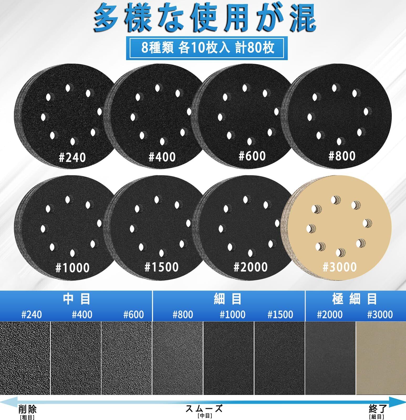 【使いやすいマジックテープ式】簡単に吸着が良い で外れることはありませんし、高速で耐久性のあるサンディングを提供することで、作業時間を節約し、集塵用に8つの穴を事前に打ち抜きます 穴の位置も正確でした目詰まりの心配はありません.一枚ずつ番手が裏に印字してあり-区別しやすい