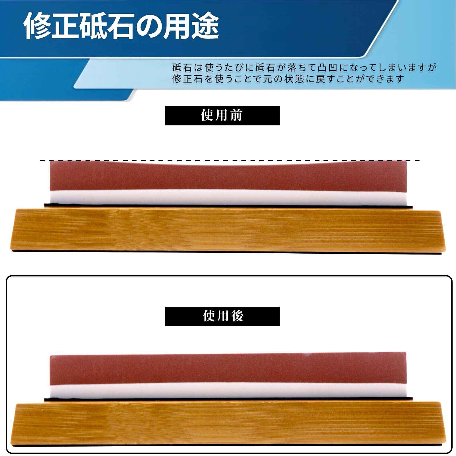 【使い勝手良好】5分から10分ほど、水に浸してから使用するので最適な、砥石面を平らになるまで前後に擦って修正します、斜め溝部が当たるように擦ります、平らになるまで擦ります、初心者でも使いやすい