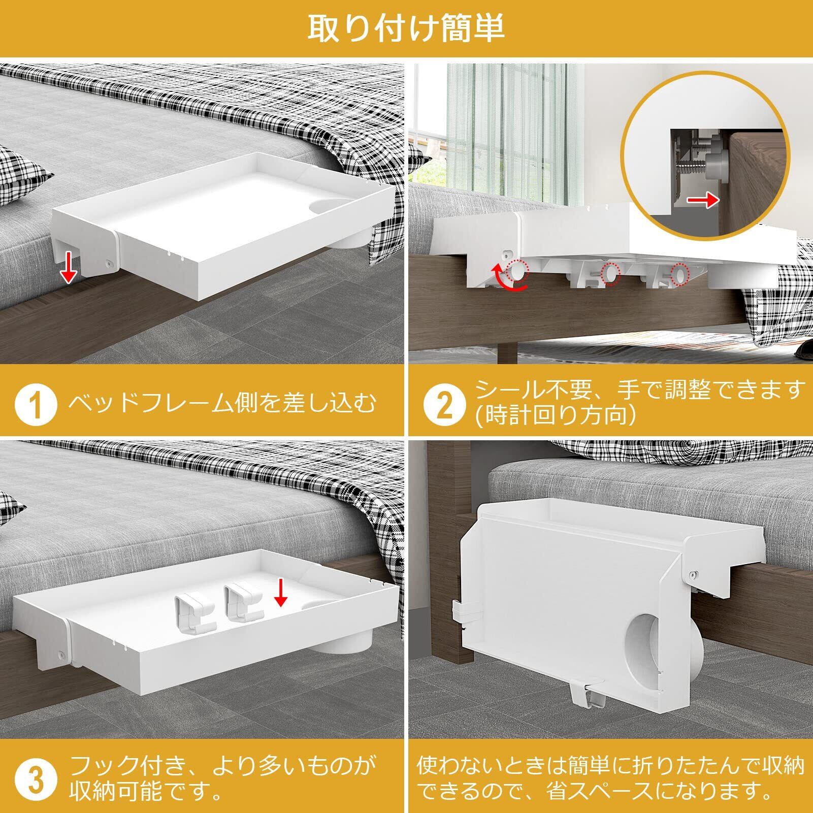 【組立簡単 ・工具不要】ベッドフレームの上に置いて、クランプのノブを締めるだけでフィットします。工具を使わず、1分以内にベッドサイドシェルフを組み立てることができます。傷防止用のラスチック足がベッドフレームを傷から守ります。