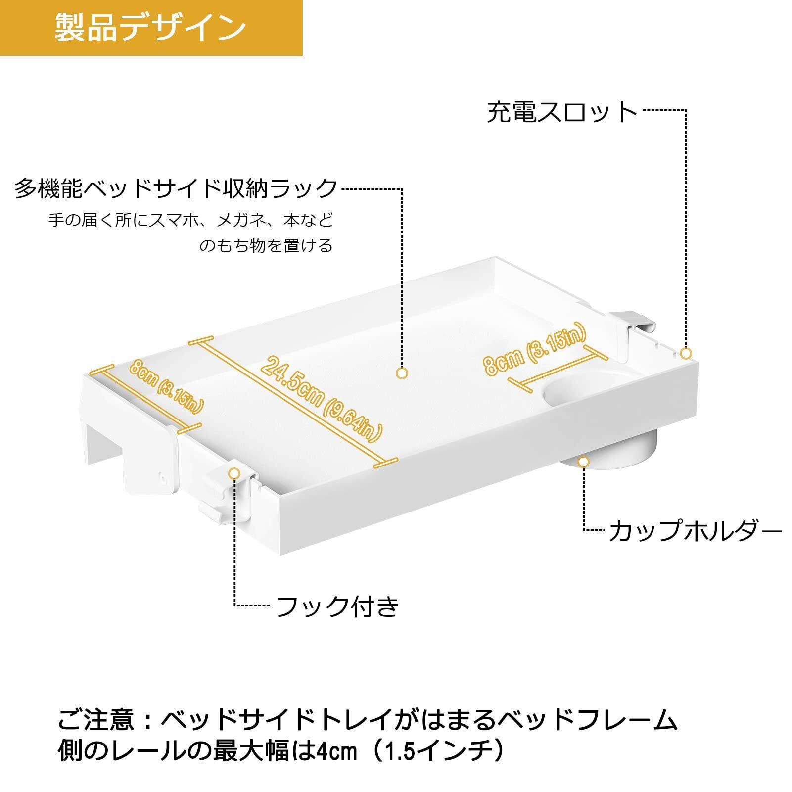 【調整可能】 サイズ:約38.99*24.5*8.5cm。クランプは調整可能で、ベッドサイドトレイがはまるベッドフレーム側のレールの最大幅は4cm(1.5インチ)で、ほとんどのベッドに適しています。