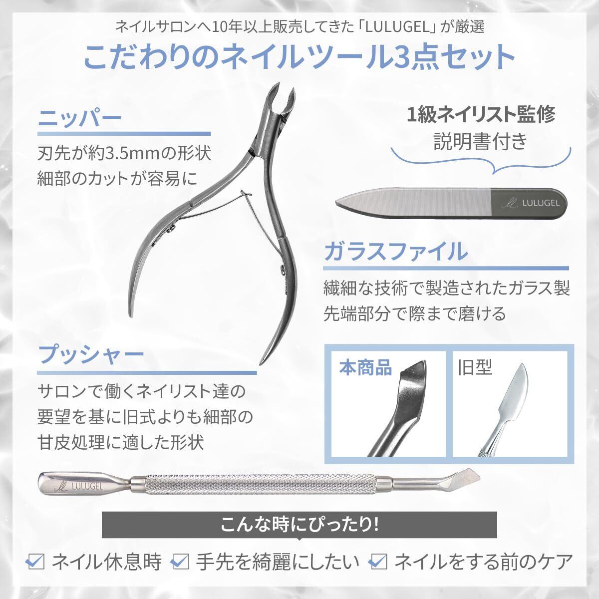 【LULUGEL甘皮処理セットS】ニッパー(爪切り可)、メタルプッシャーに素爪磨きに人気のガラスファイル(シャイナー)の爪ケアセットです。ジェルネイル前の下処理、ささくれ ケア、さかむけ切りにも大活躍。爪 ケア メンズ、メンズ ネイルの要望にもお応えできるネイルケア セットです。
