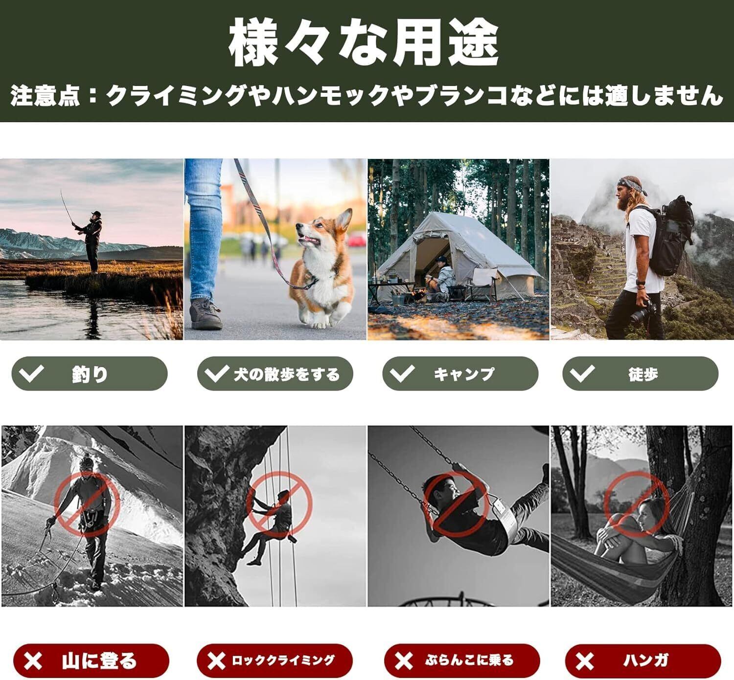 【用途】 キャンプなどの野外活動に最適、釣り、ハイキング、旅行、キーホルダー、荷物、おもちゃ、ケトル、バックパック、などの場合に対応できます。(注意: クライミング対応できません。)