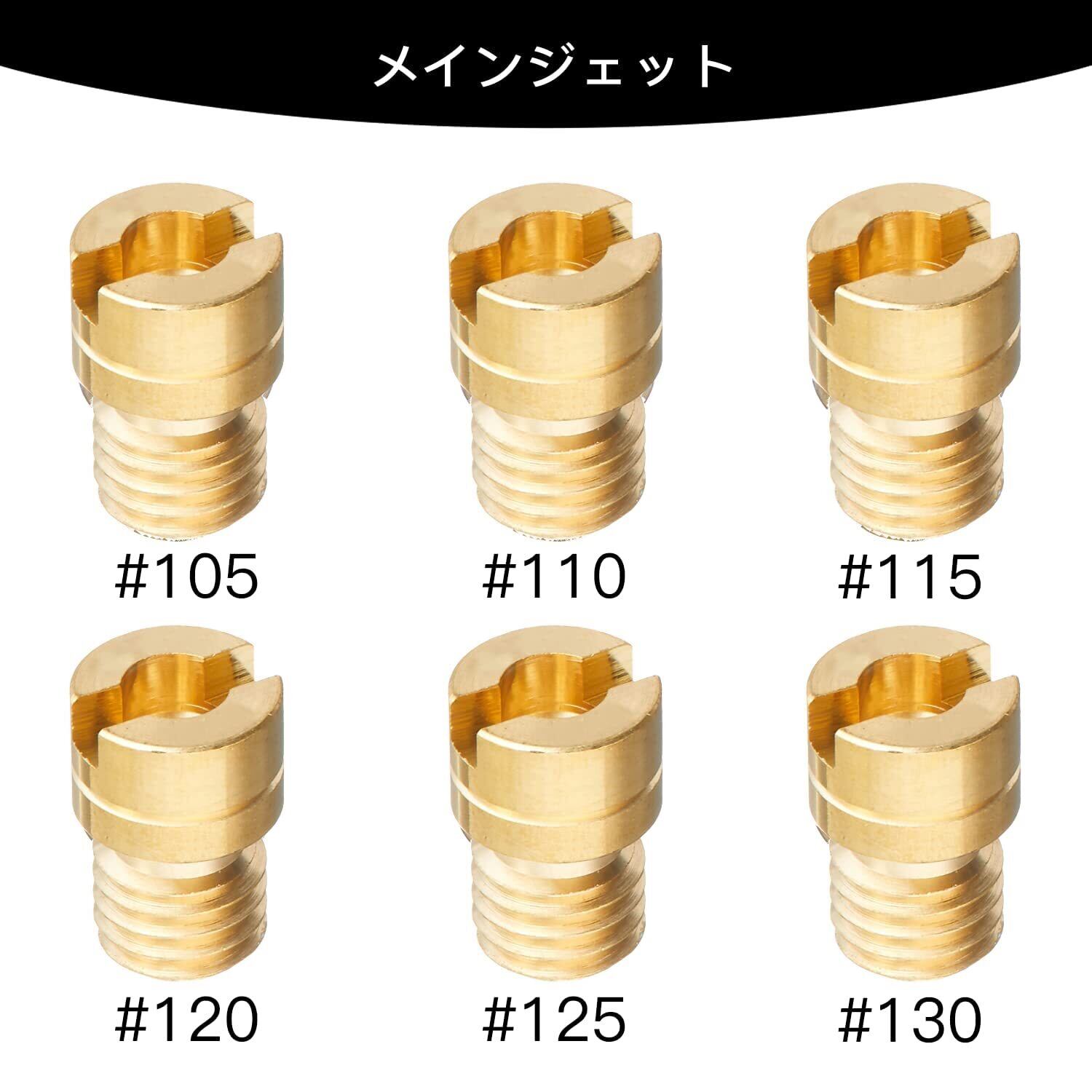 【メインジェット詳細】メインジェット ミクニ丸型/小 # 105、110、115、120、125、130。合計6個セットです。ご購入頂く前に、ご自分のキャブレターの適合サイズを確認してご購入ください。