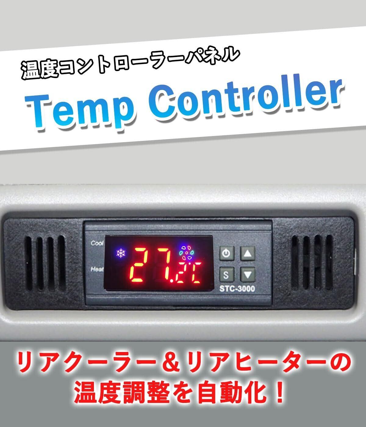 ハイエース 200系 リアクーラー&リアヒーター コントローラーです。*リアクーラー&リアヒーターの温度調整を自動化。 お好みの温度設定で、快適な室温に自動調整。本製品を取付けることにより、設定した温度に自動で空調管理できます。●任意の温度設定が可能 ※0.5℃単位。●風量は自動調整。●ヒーターとクーラーも自動切替。乗車時、任意の温度に設定しておけば、あとはセンサーが自動で室内温度を感知。希望室温に近づくごとに風量調整し、設定温度付近になると(自動で)ON/OFFを切り替え、快適温度を保ちます。注)温度センサーを接続せずに通電すると画面にエラーが表示されますが故障では御座いません。