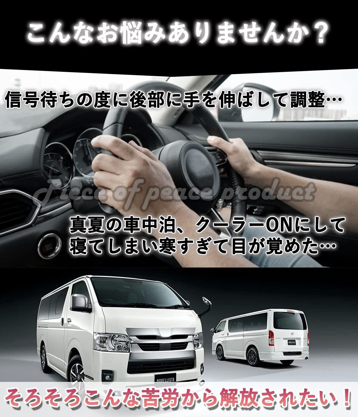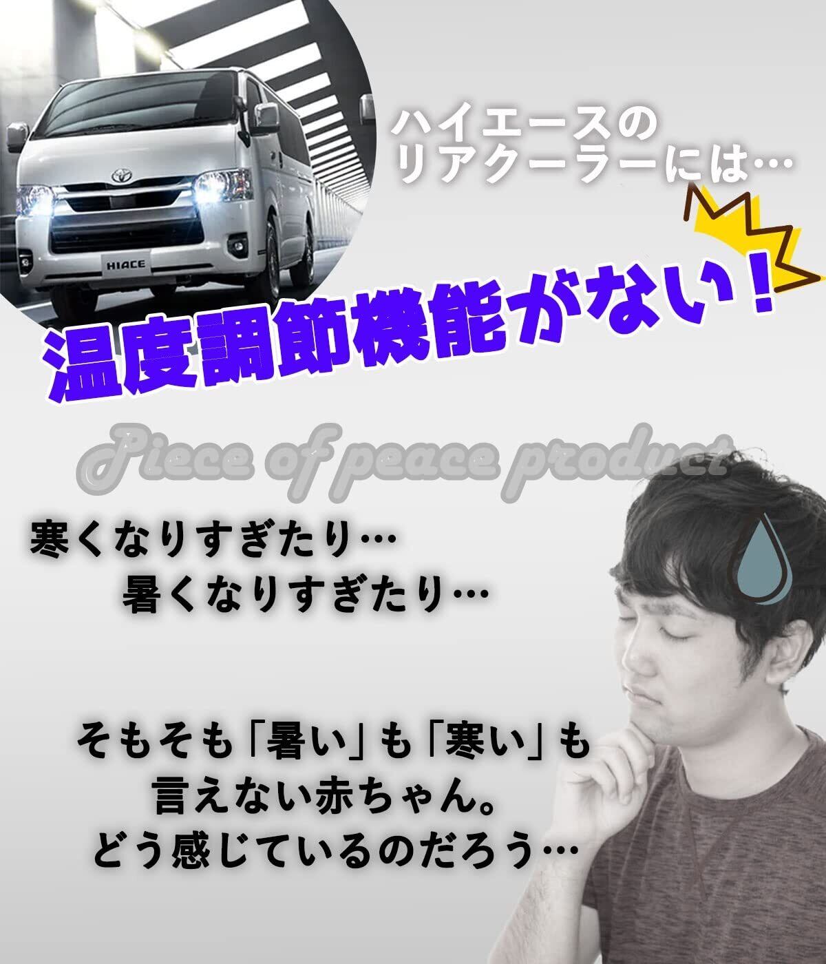 ■ 後部座席のお客さん。「暑い」と思うも、運転者を気遣い言い出せず。我慢。■ そもそも 「暑い」も「寒い」も言えない赤ちゃん。どう感じているのか心配。「そろそろこんな苦労から解放されたい!」という方も多いことでしょう。そこで今回お勧めするのが、そんな気苦労からあなたを開放し、ハイエースを快適空間に変えてくれる超優れもののアイテム。