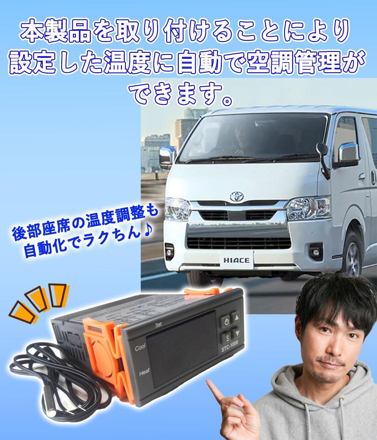 ハイエース 200系 リアクーラー&リアヒーター コントローラーです。*リアクーラー&リアヒーターの温度調整を自動化。 お好みの温度設定で、快適な室温に自動調整。本製品を取付けることにより、設定した温度に自動で空調管理できます。●任意の温度設定が可能 ※0.5℃単位。●風量は自動調整。●ヒーターとクーラーも自動切替。乗車時、任意の温度に設定しておけば、あとはセンサーが自動で室内温度を感知。希望室温に近づくごとに風量調整し、設定温度付近になると(自動で)ON/OFFを切り替え、快適温度を保ちます。*配線は付属致しませんので別途ご用意下さい。注)温度センサーを接続せずに通電すると画面にエラーが表示されますが故障では御座いません。