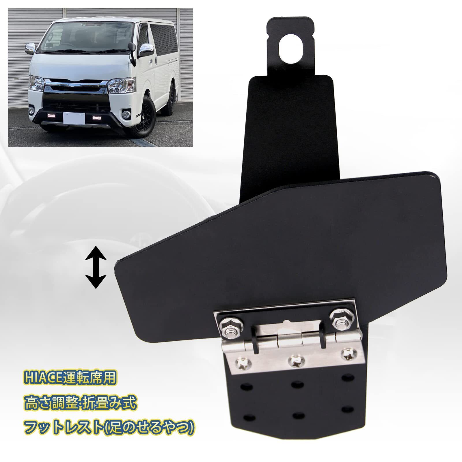 製品の特徴:長時間運転する際、ハイエースの運転席には左足を伸ばす場所が必要です。だから運転席用折り畳めるフットレストは必要です。