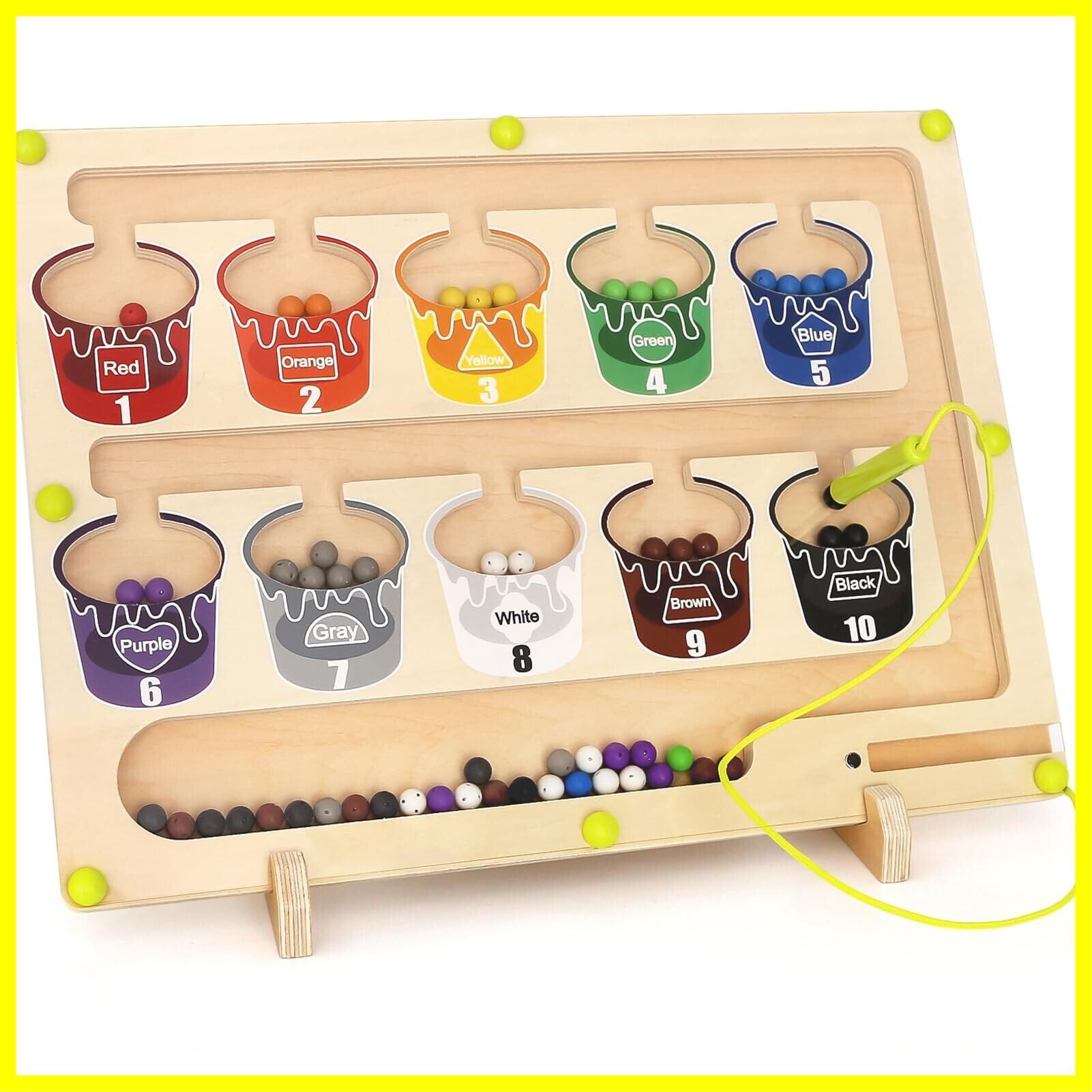 モンテッソーリ 知育玩具:色を探したり、数を数えるためのマグネット式幼児用ゲーム。木のおもちゃの迷路には、1~10の数字を表す10個の「ペイントポット」と、お子様が数を数えられるように10色の明るい色の65個のマグネットビーズが組み込まれています。3 4 5 歳 誕生日プレゼント。