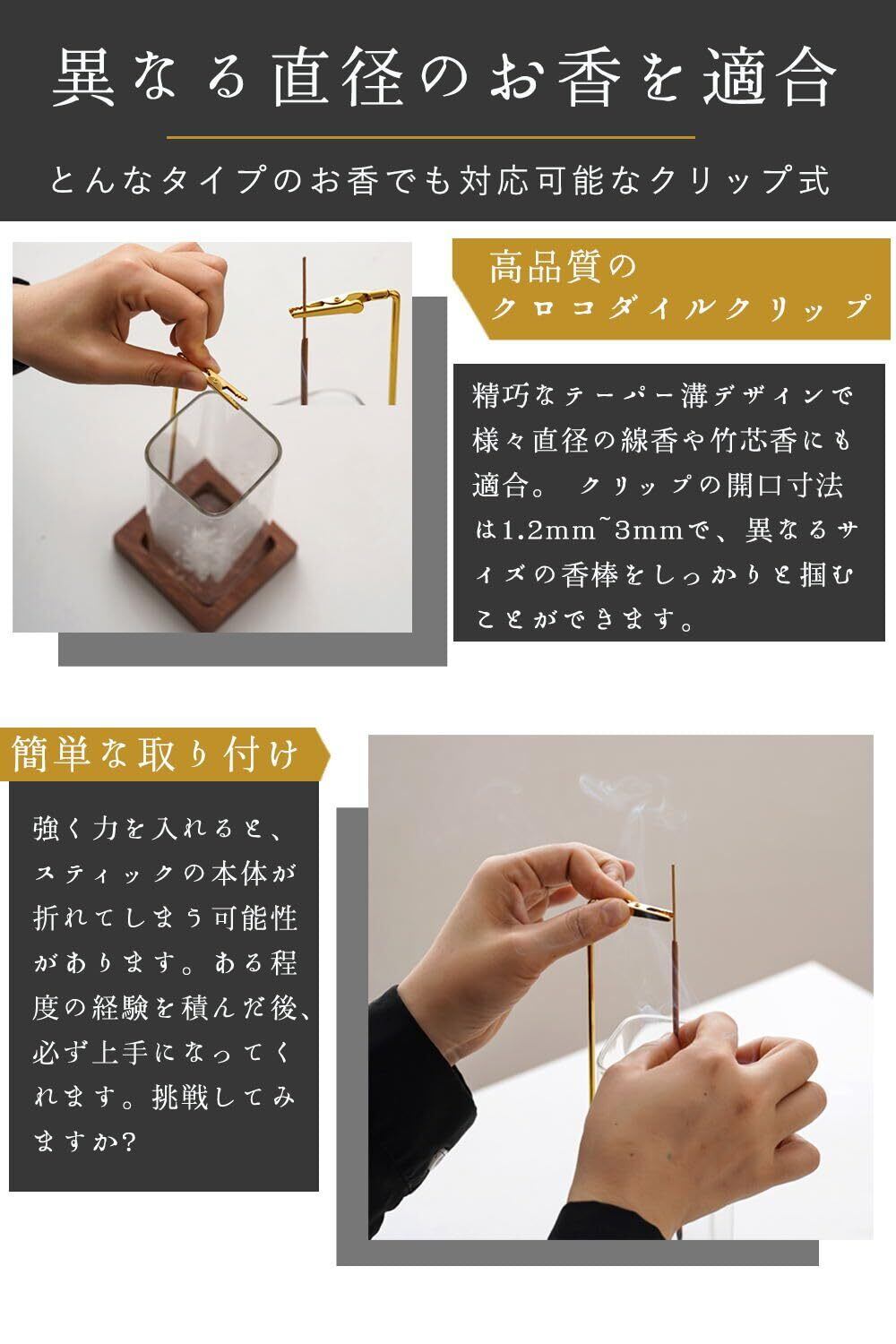 【お香立て オシャレ】精巧なテーパー溝デザインで様々直径の線香や竹芯香にも適合。 クリップの開口寸法は1.2mm~3mmで、異なるサイズの香棒をしっかりと掴むことができます。強く力を入れると、スティックの本体が折れてしまう可能性があります。ある程度の経験を積んだ後、必ず上手になってくれます。挑戦してみますか?