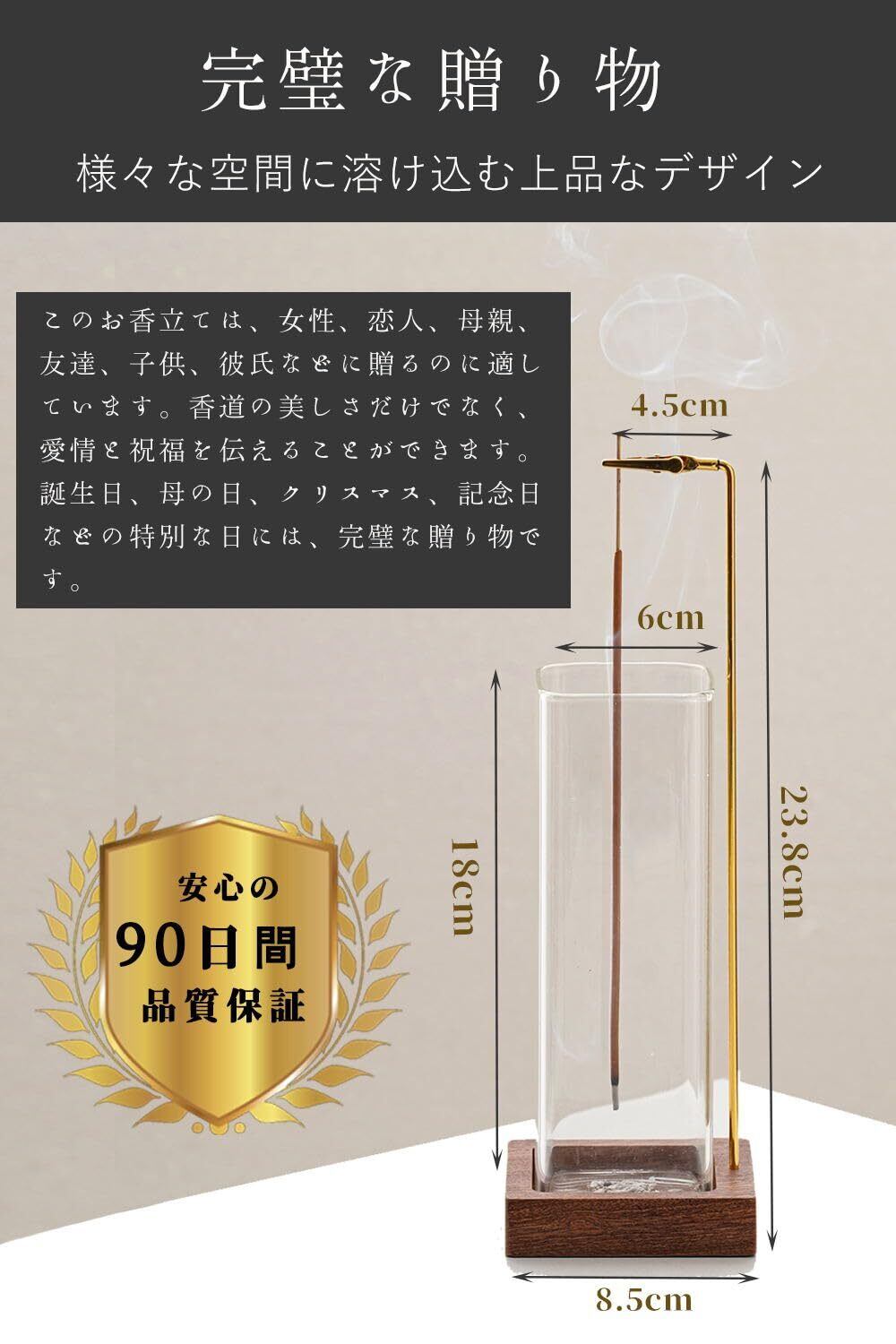 【灰が散らばらない】このお香立ては、通常のものよりも高いガラスカップが付属しており、お香が最後まで燃焼しても灰が外に落ちることはありません。より快適で安心した香道体験を提供します。溜まった灰はゴミ箱に捨てるだけ。透明ガラス製だからお香の燃焼経過を存分に愉しむことができます。さらにお香に手や周囲物が直接触れないため安全です。