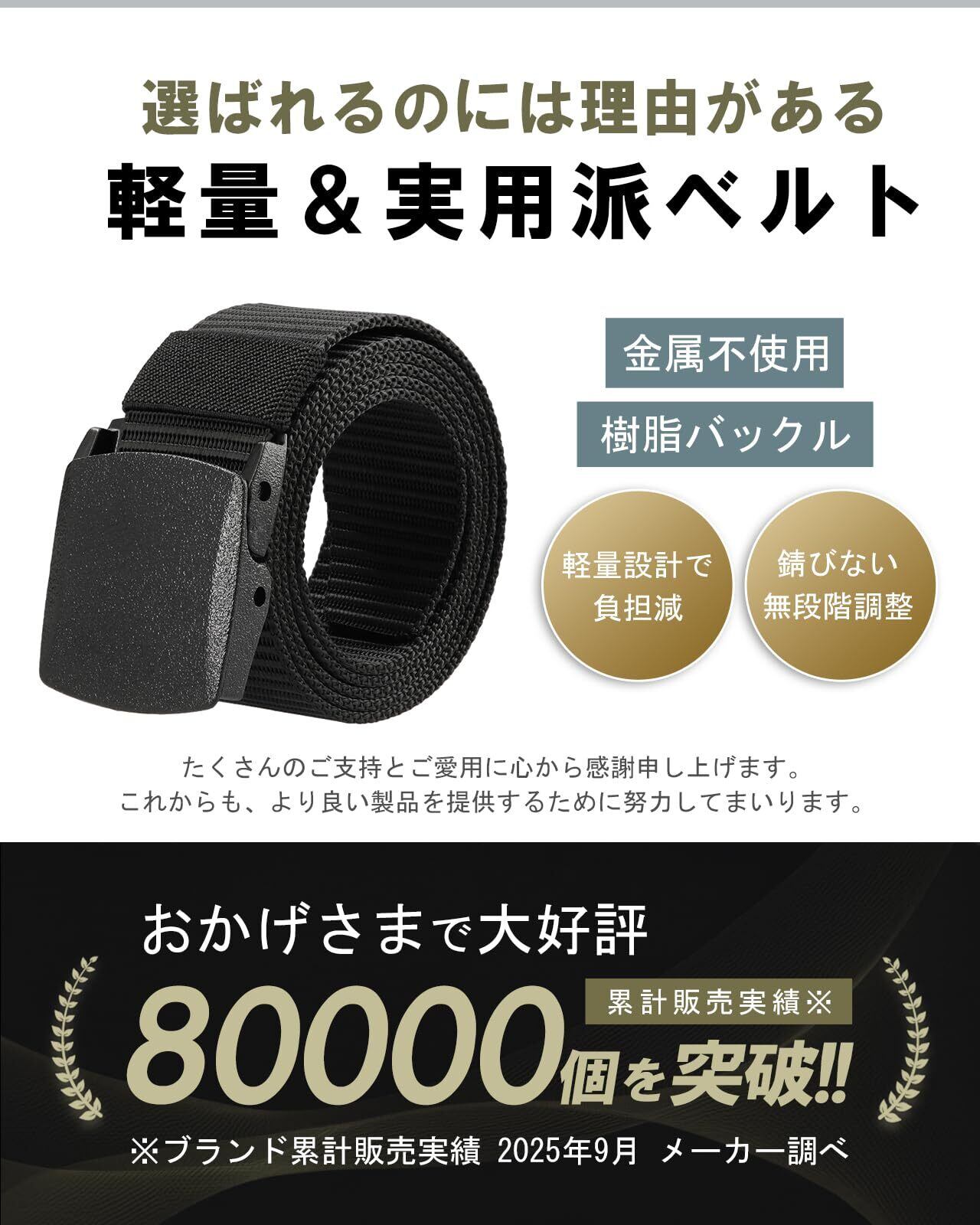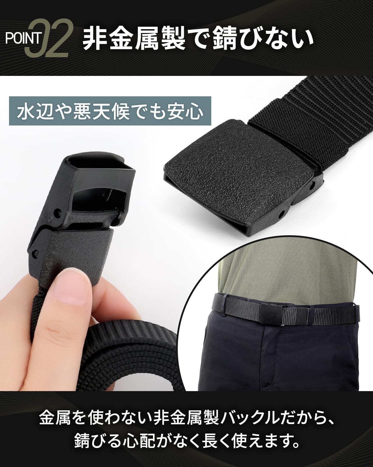 【非金属バックル】錆びる心配もなく、長期間使用しても劣化しにくいのが特徴です。金属を使用しない樹脂製バックルなので、金属アレルギーで肌が荒れる心配がありません。また空港の出入国前の手荷物検査でベルトの着脱は不要です。