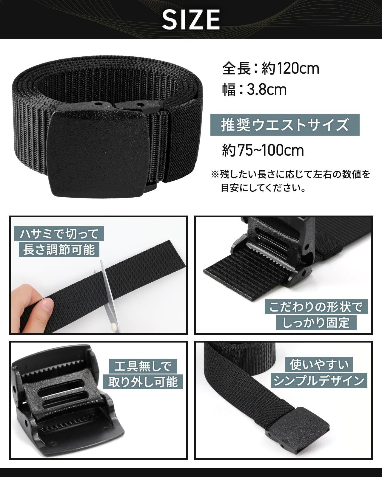 【工具不要で調整簡単】ナイロンベルトは特別な工具を必要とせず、簡単に長さ調節ができます。バックルを外してベルトをカットするだけで、自分にぴったりのサイズに調整可能。これにより、使いやすさとフィット感を両立します。