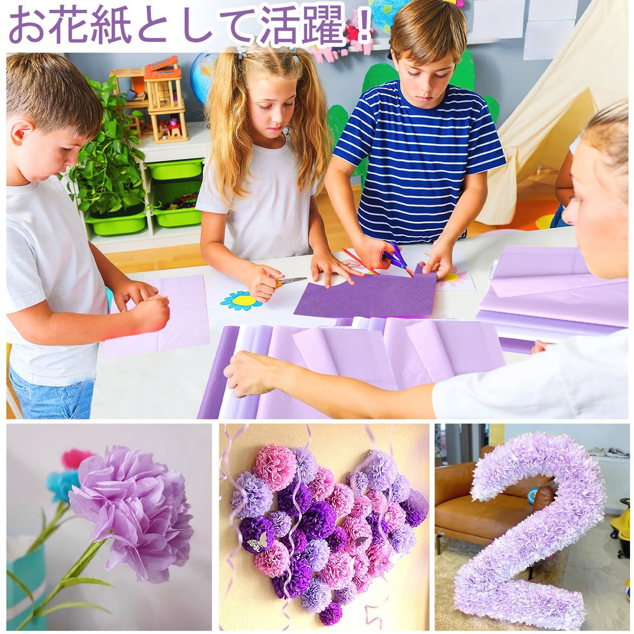 【豊富なカラー】ホワイト、ライラック、藤紫、紫、合計4種類のカラーのお花紙を用意しております。多様な紫色で、自由にDIYできます。単色だけでなく、多色の紙を組み合わせてもキレイなペーパーフラワーは作れます。