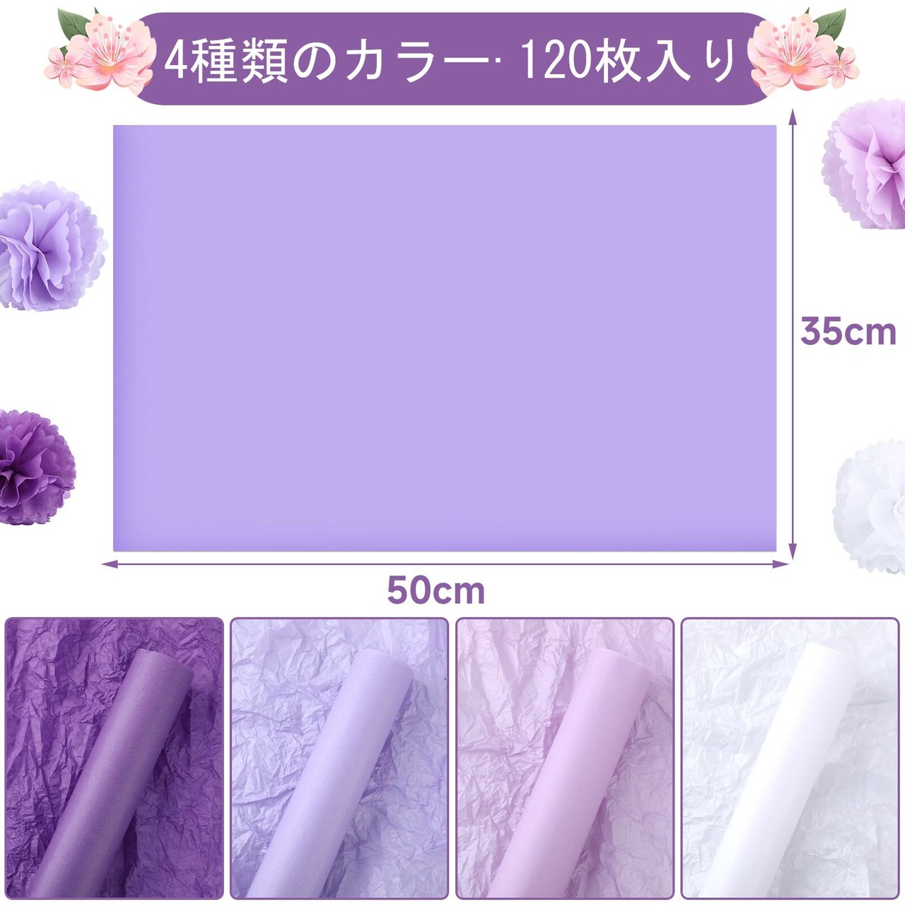 METBOU お花紙 薄葉紙 120枚 おはながみ 紫 大判 ラッピングペーパー ラッピング 紙 母の日 包装紙 ペーパーフラワー 紙 ペーパーポンポン ラッピングペーパー 35cm×50cm