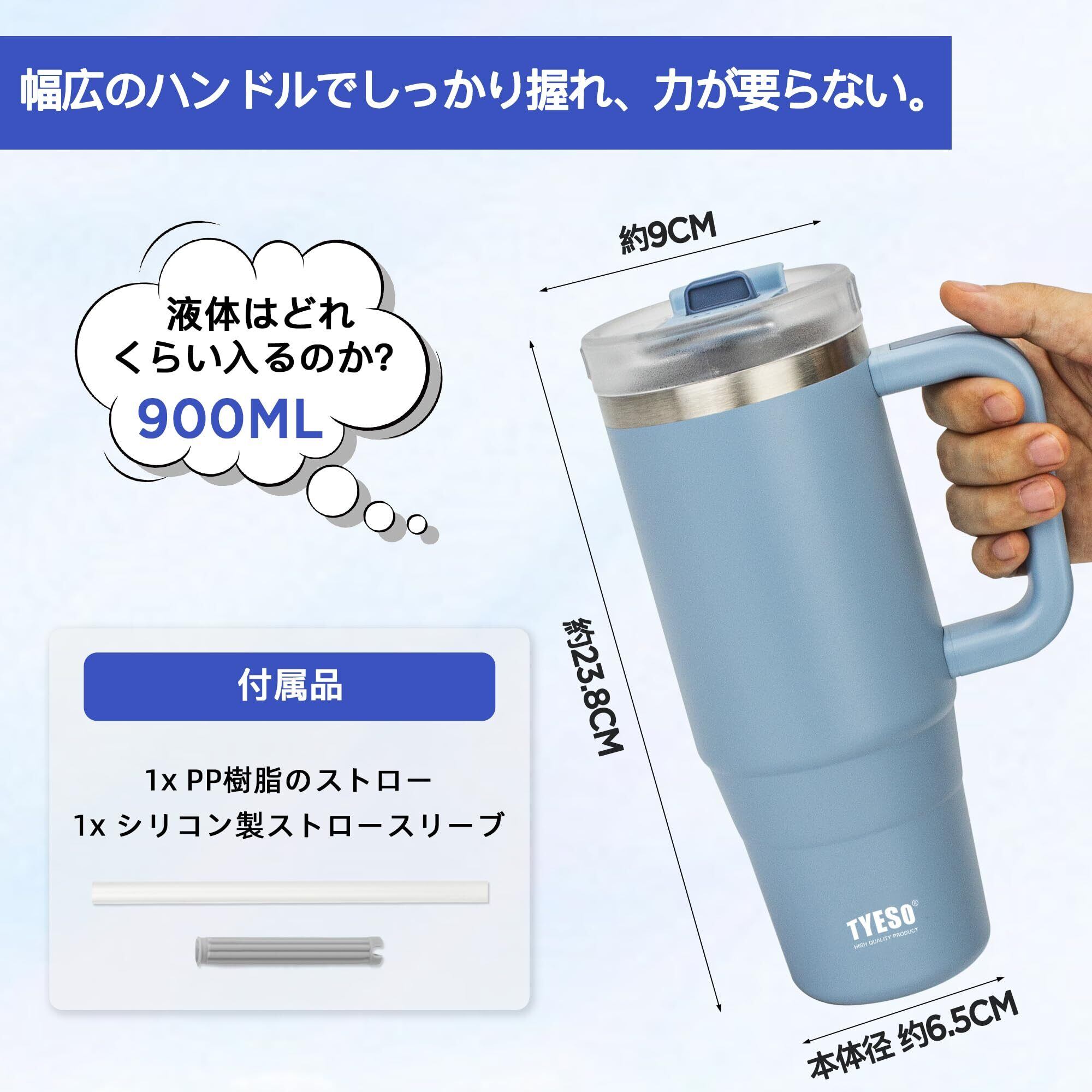 TYESO タンブラー 0.9L 水筒 保冷 ステンレスボトル ウォーターボトル ストロー 取っ手付き ジョッキ アウトドア 真空断熱 二重構造 広口 大容量 直飲 女の子 男の子 900ml スカイブルー
