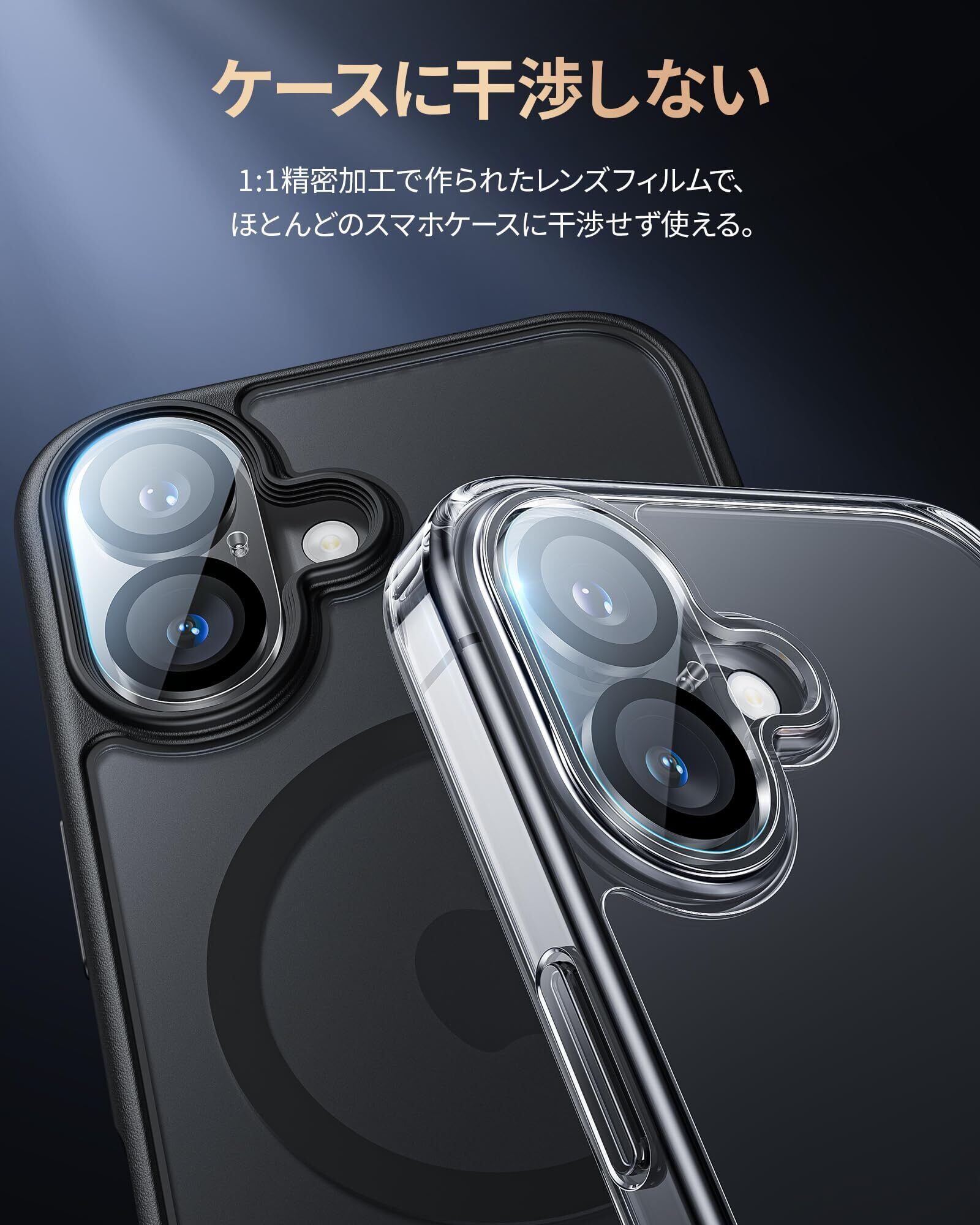 「全面保護&防塵効果」iPhoneのサイズに合わせて1:1で精密に設計されており、カメラ部分の四角い台座まで保護しながらも、ケースと干渉しません。いPhone17/あいほん16/16Plusのカメラに密着することで、レンズを保護しつつ、カメラレンズの中にホコリが入り込むのを防ぎます。レンズ部分の強力な保護層がレンズ表面を清潔で傷のない状態に保つので、レンズの寿命を効果的に延ばすことができます。