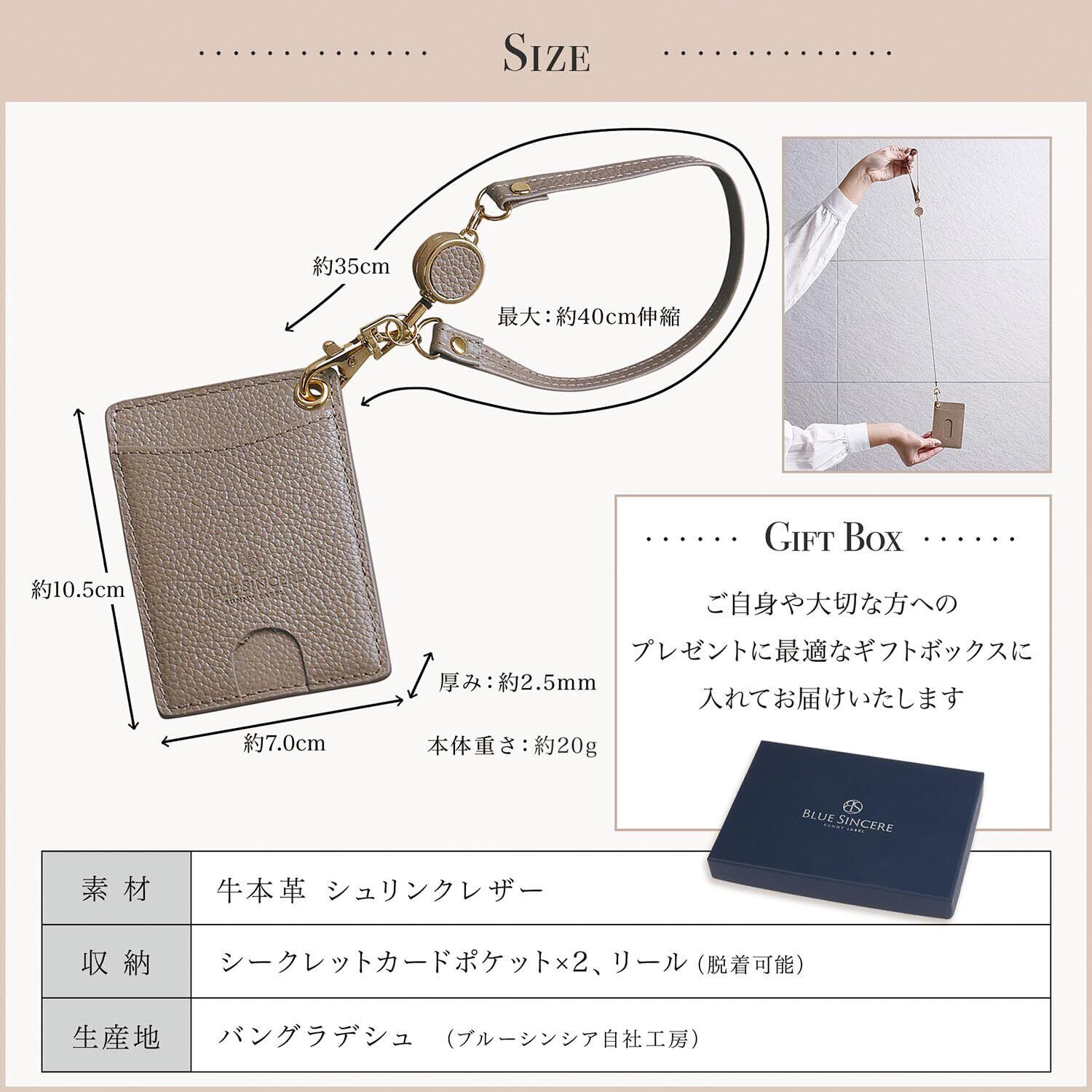 【タッチもチャージもスマートに】 よくある伸縮リールに比べ、このパスケースは30cmと少し短くなっています。 バッグから改札のタッチパネルや会社の入室用タッチパネルまでの距離を考慮し、最小限に抑え耐久性を上げました。 毎日使うものだからこそ、どんな状況でも長く使える商品を目指した設計です。