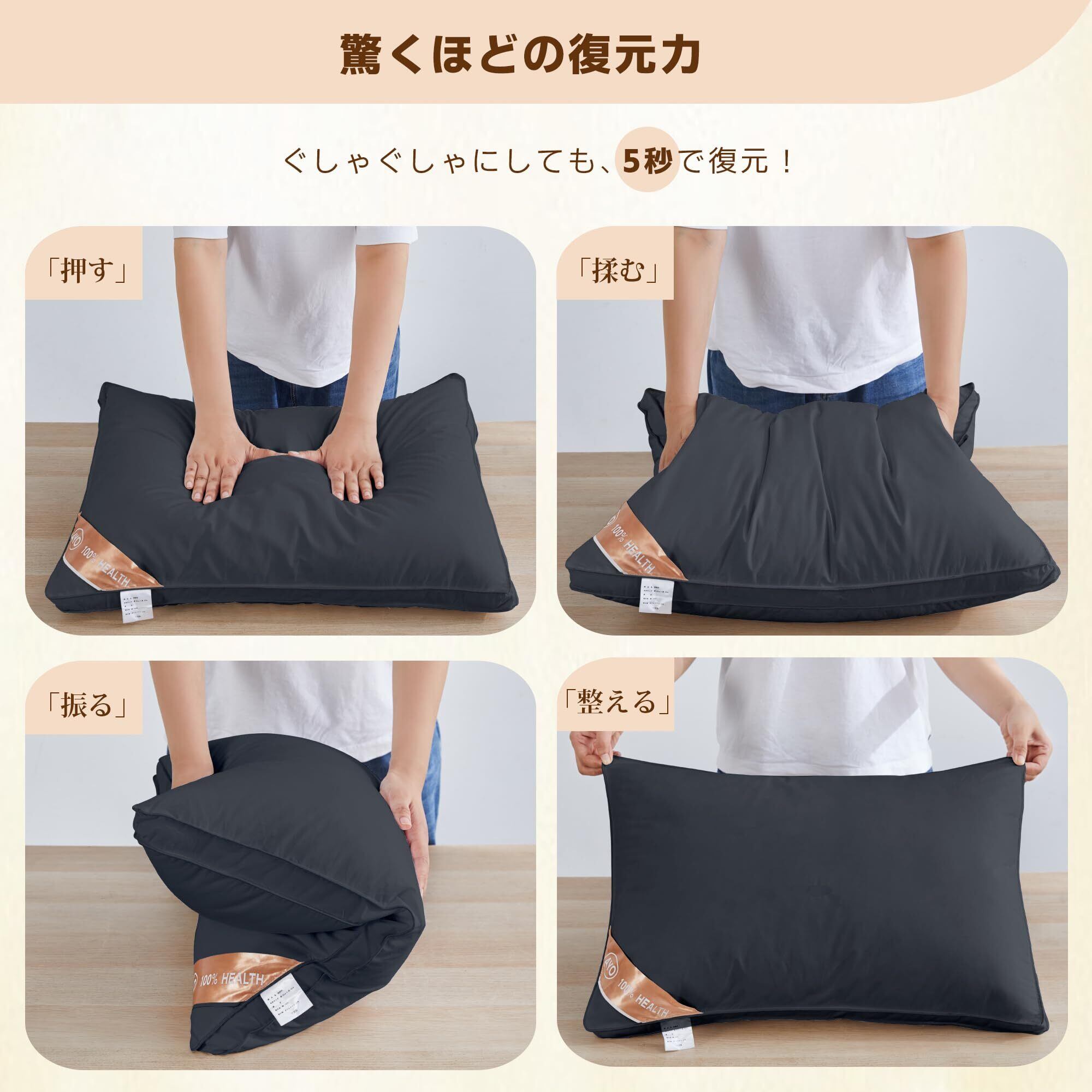 【立体構造】柔らかさと高反発性を兼ね備えた構造であり、ボリューム感よく、羽毛のように叩けばふわーっと飛 び散る性質をもっています。適度な復元力と弾力があり、しっかりと頭を支え、お好きな寝姿でぐっすり眠れます。