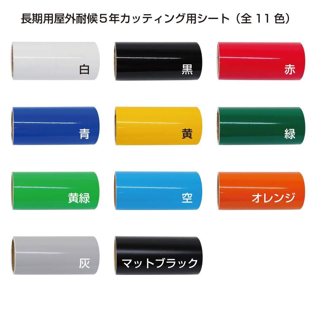 光沢タイプ屋外耐候5年のカッティングシート。黒は艶消もあります。黄とオレンジは白糊、他は透明糊です。丸和書店オリジナル商品です。アプリケーションシートもございます。