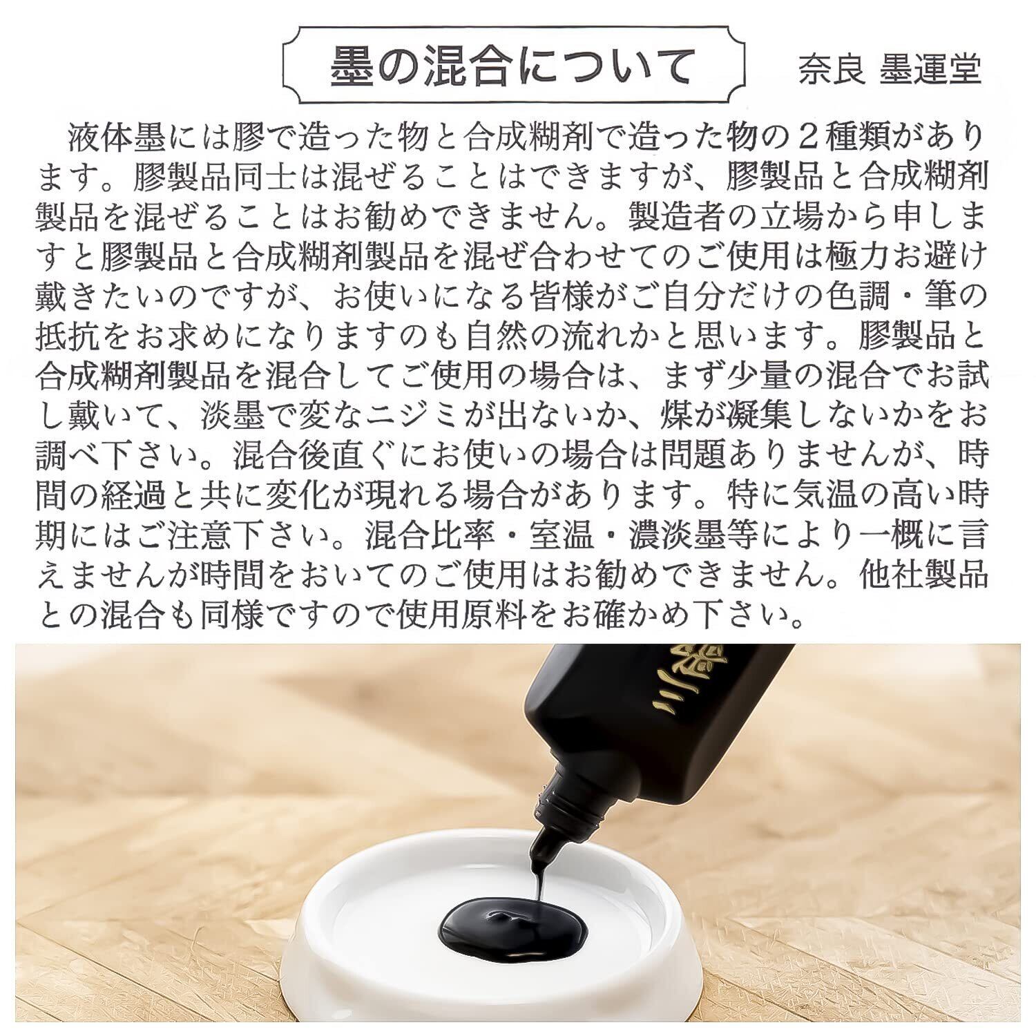 高級固形墨と同じ純植物性油煙を原料として、小筆に適した書きやすい液体墨。