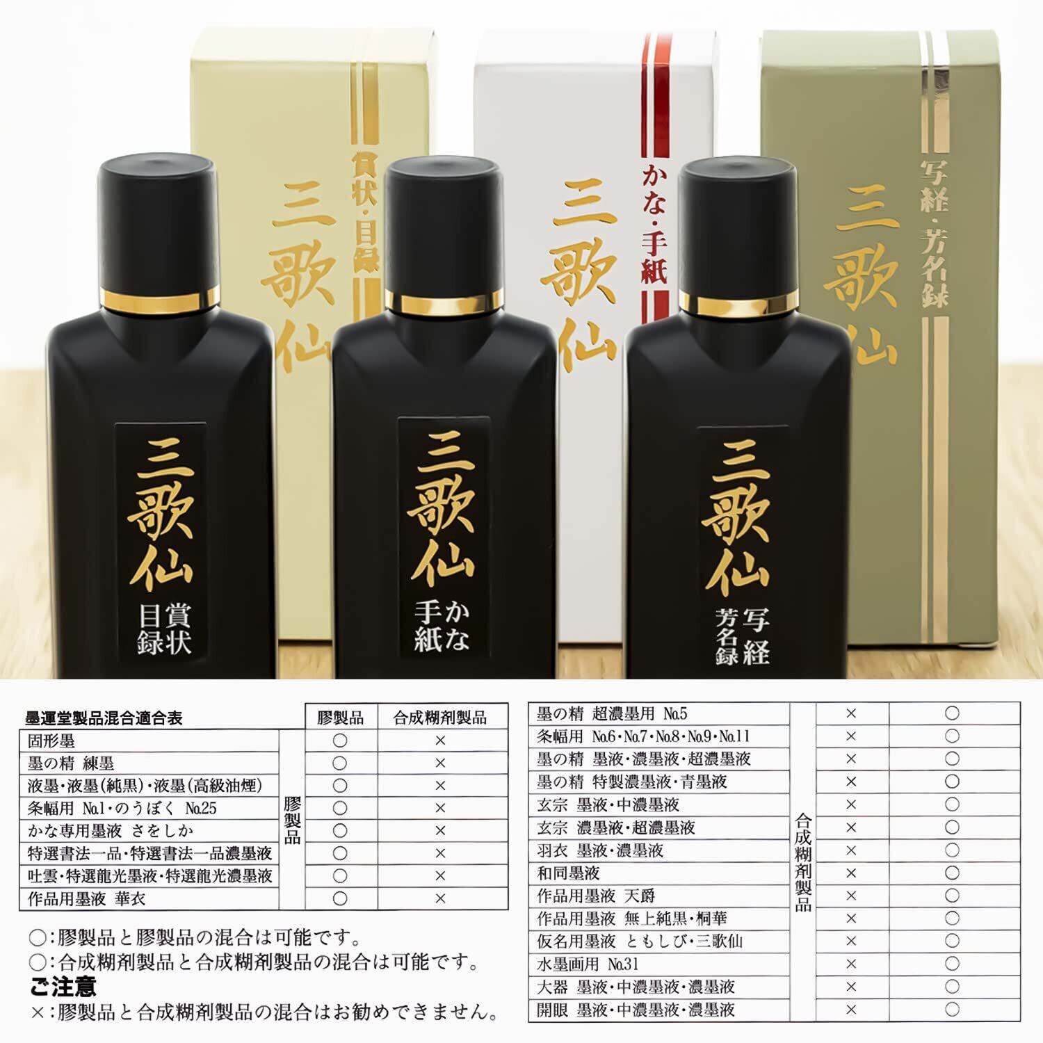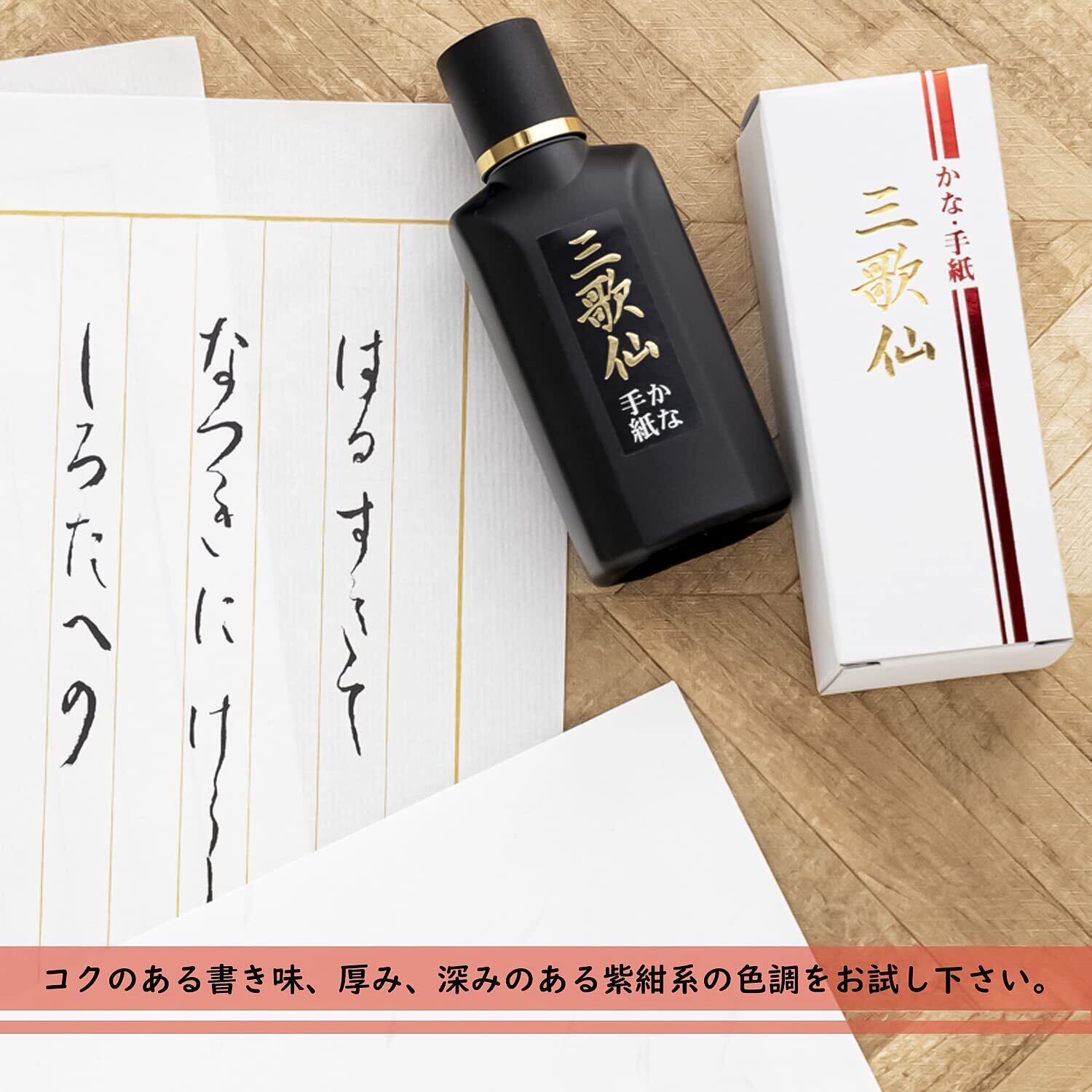 【三歌仙】 高級固形墨と同じ植物性油煙を原料として、小筆に適した書きやすいよう開発された液体墨