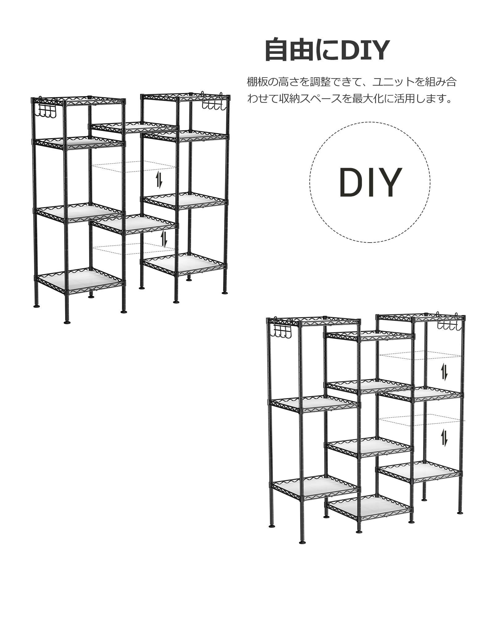 【棚あたり調節可能・自由にDIY】棚一枚の高さは置物によって調整可能、キッチン収納ラックとしても、洗面所収納ラックとしても、リビングルームの収納にも、自由にDIY出来ます