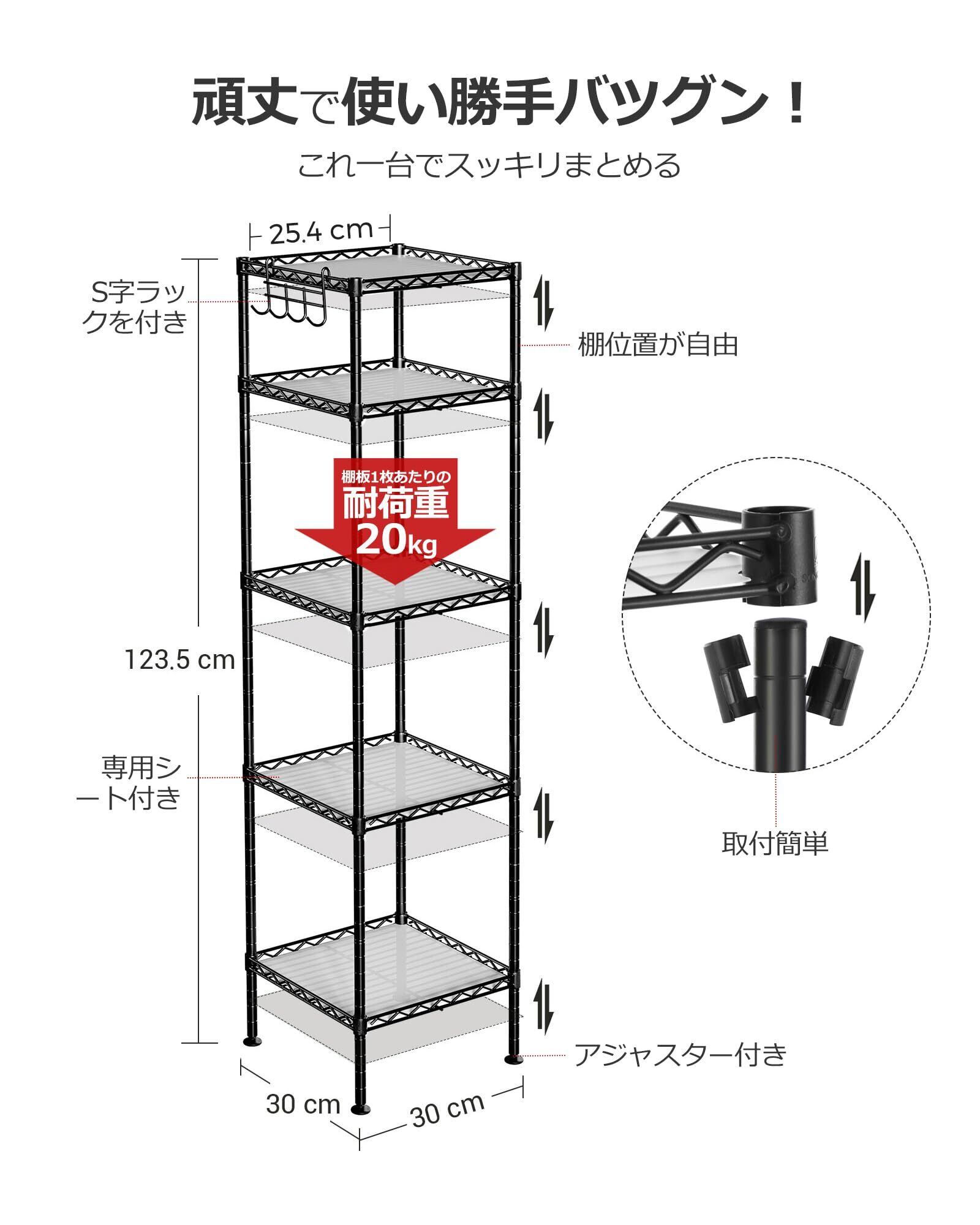 SONGMICS ラック 30cm スリムメタルラックスチールラック オープンラック スリム 幅30棚 ラック おしゃれ 5段 隙間収納 棚 スリム キッチンワゴン 収納ラック 高度 調整可能 おしゃれ シェルフ 奥行30 一人暮らし LGR023BK