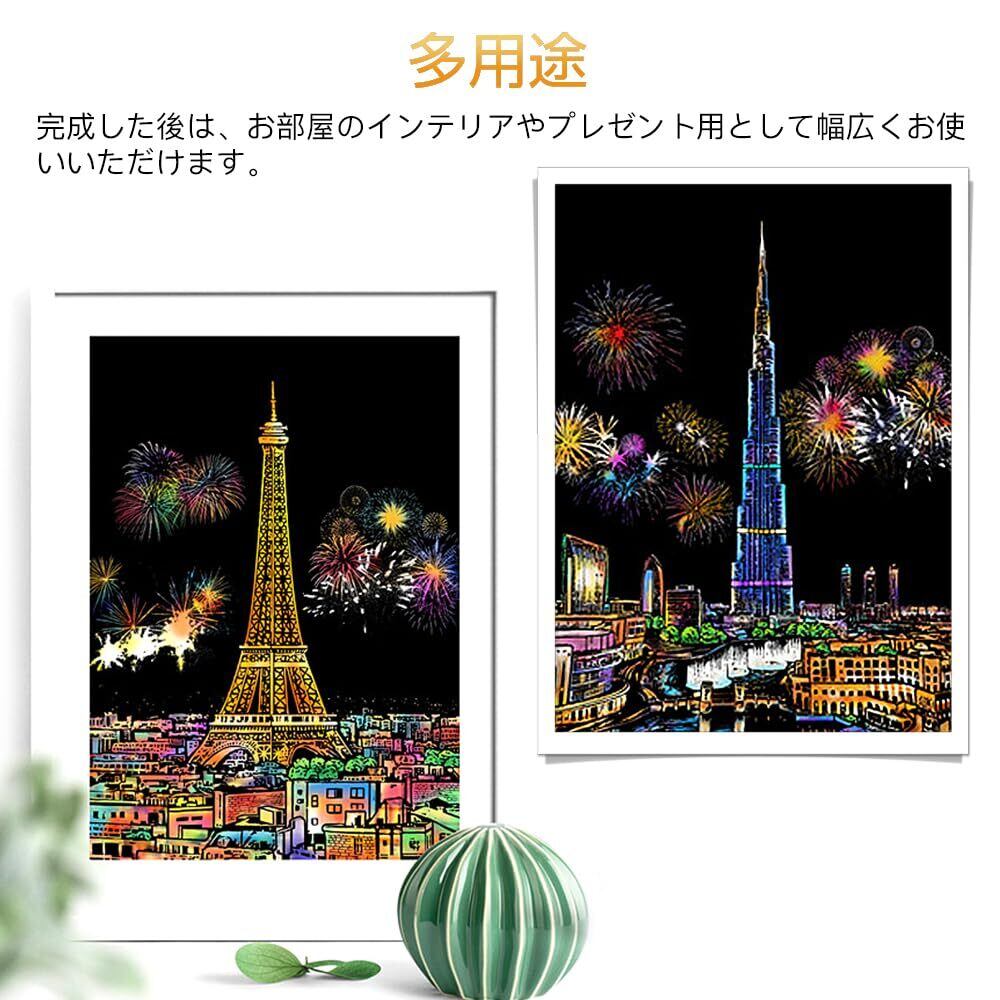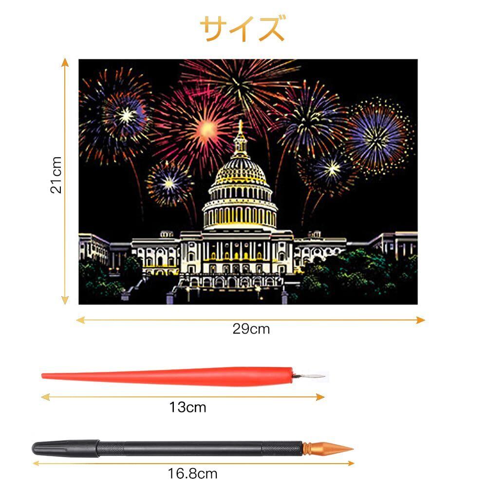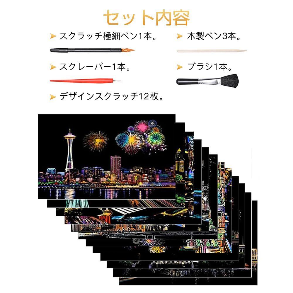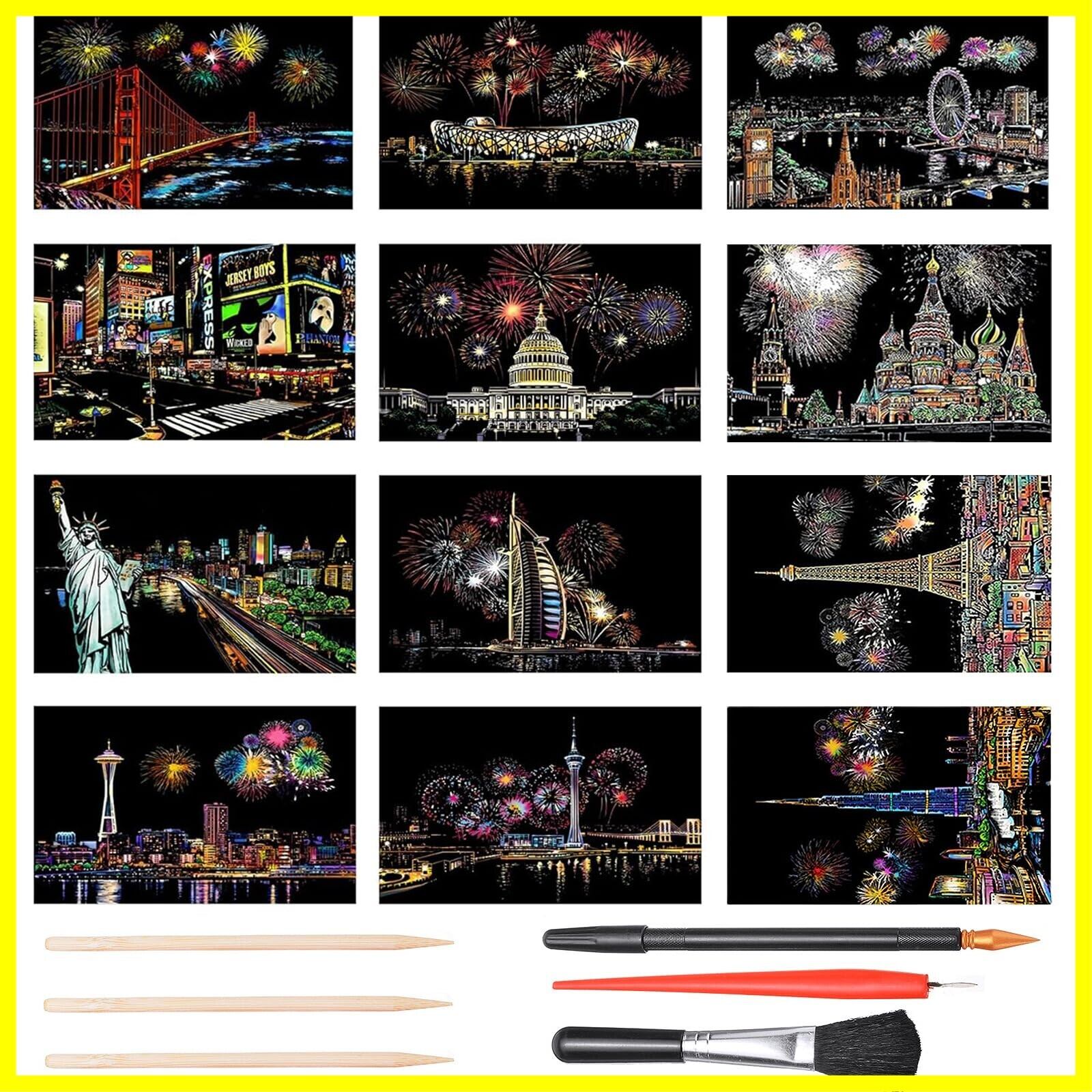 LIANHATA スクラッチアート 12枚入 スクラッチ極細ペン付き 21*29cm A4サイズ スクラッチペーパー レインボー絵 夜景 花火 観覧車 花畑 彫刻アート DIY 削るだけで美しいアート 部屋飾り (花火シリーズ)