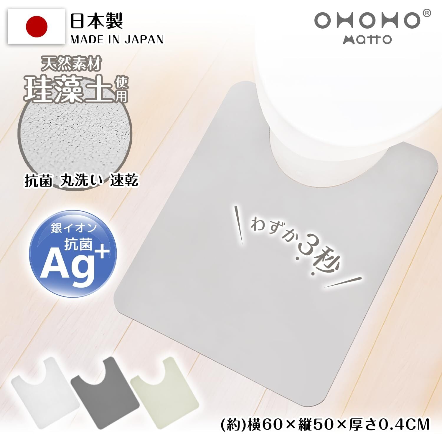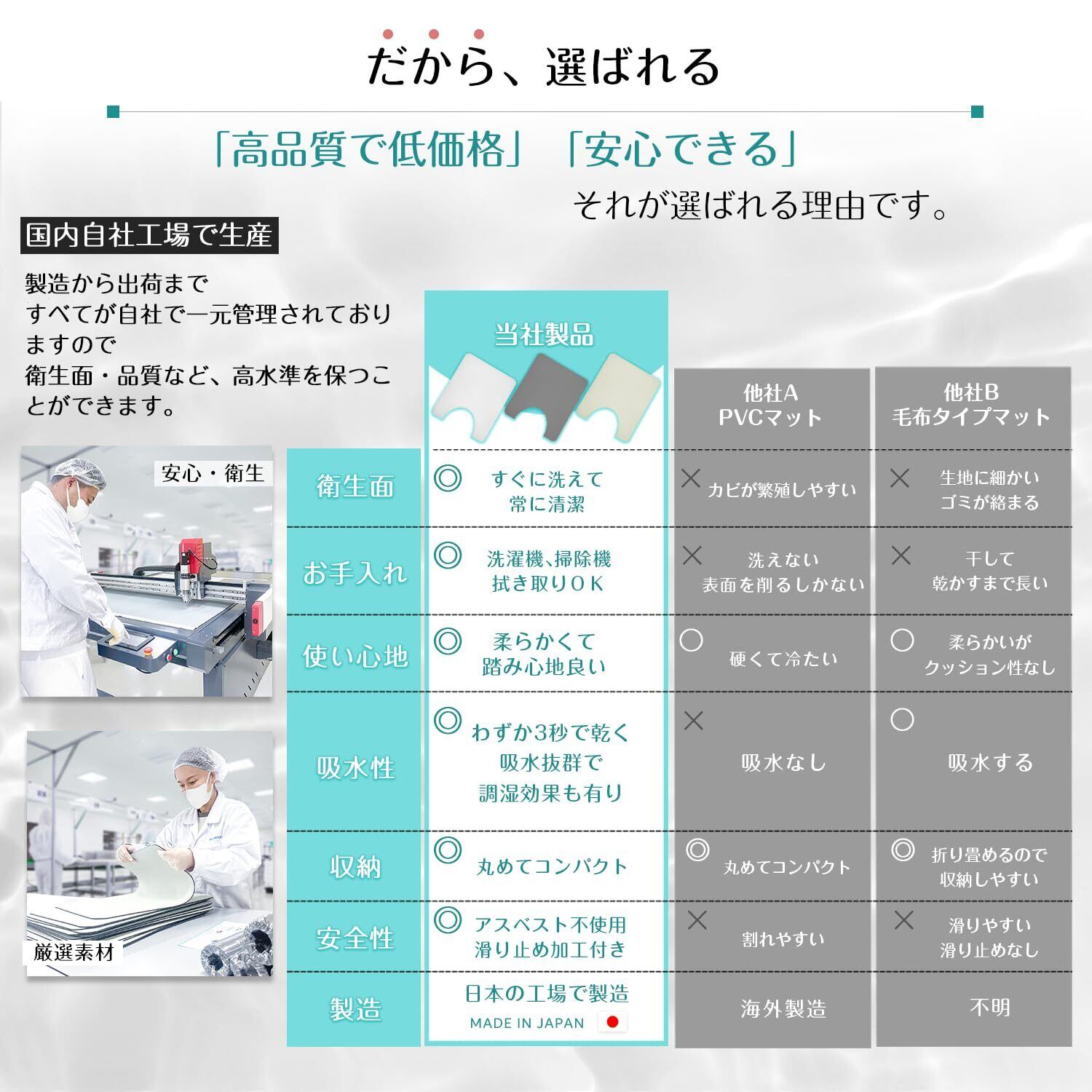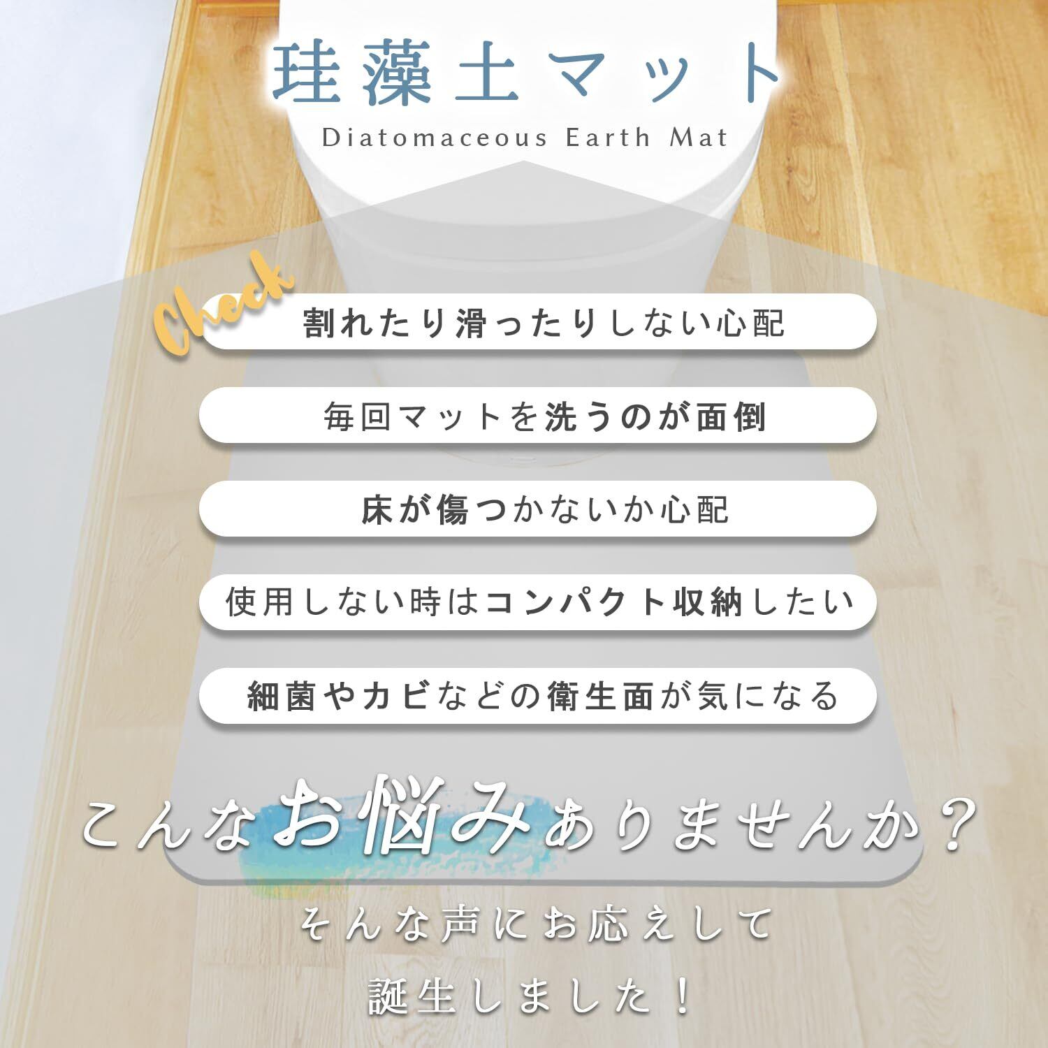 【銀イオン配合】抗菌・防臭の効果があります。細菌の表面や体内のたんぱく質の構造を変化させ、雑菌の繁殖を防ぐので細菌による腐食臭を抑止します。 【珪藻土配合】吸水・吸湿・放湿する『調湿』という優れた機能を持っています。 珪藻土は、植物性プランクトンの化石を原料としており、無数の小さな穴があります。 これによって、高い吸水性と速乾性を兼ね備えています。 【日本製】福岡にある工場で徹底した品質管理の基に製造を行っております。 さらに、衛生面に配慮した環境下にて再度目視で検品を行い、安心安全の製品をお客様に提供しております。 【ソフトタイプ】柔らかくモッチとした感触です。クッション性があり、冬でも冷たくなく、足触り快適です。 【滑り止め加工】トイレマット裏面にはPU素材を使用しておりしっかり吸着します。また接地面の傷防止にも効果的です。 【ノンアスベスト】アスベストは、一切使用しておりません。第三社機関による厳格な検査を経て、ノンアスベストである証明書を取得しています。 【衛生的】汚れても丸洗いできます。洗濯ネットをご使用することで洗濯機での洗浄可能です。手洗いの場合、濡れた布でやさしく拭き取るか水で薄めた中性洗剤で洗い、水で洗い流して下さい。洗浄後は、風通しの良い場所で陰干し乾燥させることで繰り返し使用でき常に清潔な状態を保つことができます。