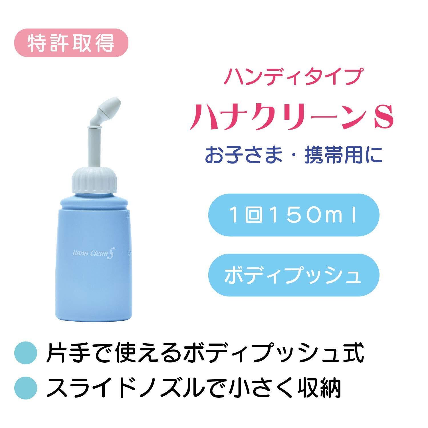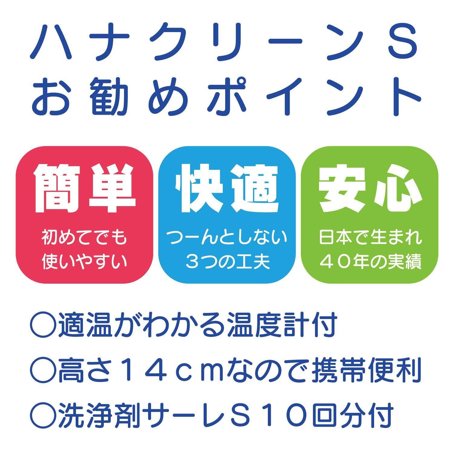 ●鼻洗浄器ハナクリーンS(サーレS10包付)と専用洗浄剤サーレS50包入りのセットになります。 ●ご使用になる前に必ず取扱説明書をお読みください。 (ハナクリーンSの特長) ●1回150mlお手軽洗浄のハンディタイプ。 ●お子さまや携帯用に。 ●片手で簡単ボディプッシュ。 ●スライドノズルで収納便利。 ●つーんとしない鼻洗浄の3条件を調節できるので初めての方でも快適です。 1温度 温度計と水量メモリでやさしい温度 2濃度 洗浄剤サーレで痛くない濃度 3水圧 快適3本シャワーと調節自在な水圧 (使用方法) 1ノズルをしっかり引き上げ、ボトルから上部を外します。 2ボトルに約40℃のお湯を注ぎ、背面の温度計で適温の確認をします。 3専用洗浄剤「サーレS」を1包入れてよく溶かします。 4上部を戻してボトルにしっかり取り付けます。 5洗面所などで前かがみになり、ノズルを軽く鼻にあて「エー」と発声しながら適切な水圧で交互に洗浄します。 6洗浄後はやさしく片方ずつ鼻をかみ、器具はお手入れをしてから保管します。