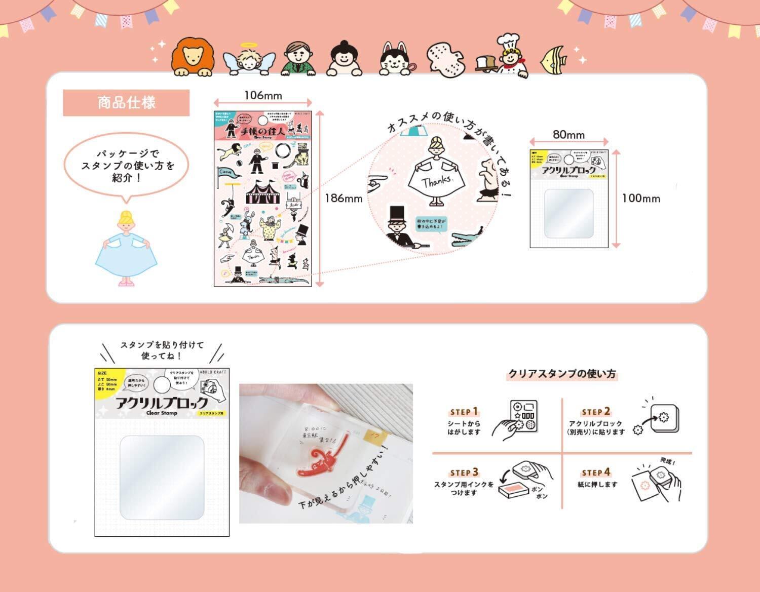 透明で押しやすく収納もラクラク、約20種類もの豊富なかわいいスタンプパーツがシート状になった、クリアスタンプとアクリルブロックのセットです。