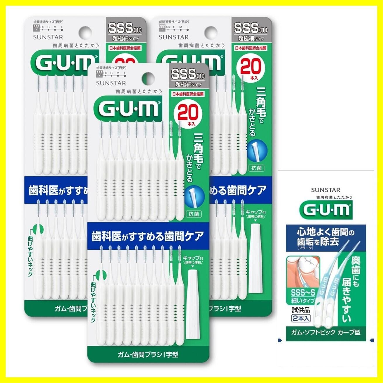GUM(ガム) 歯間ブラシ I字型 ワイヤータイプ [サイズ:SSS (1)] 20本入×3個パック+おまけ付き