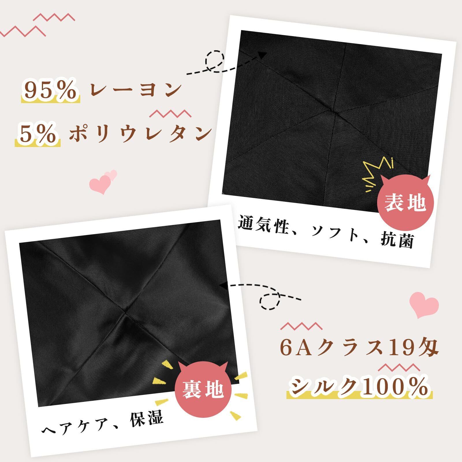 【独特なデザイン】裏地:6Aクラス19匁シルク100% 表地:95%レーヨン 5%ポリウレタン サイズ:フリーサイズ ナイトキャップ平置 :縦30cm 横幅28cm 外側の生地は通気性が良くて、伸縮性が高く、自由に折りたたむことができます。裏地のシルクは保湿力があり、頭皮の乾燥やパサつきがちな髪の毛に良いです。朝のスタイリングが楽になります。この帽子は頭囲50-60cm向けです。