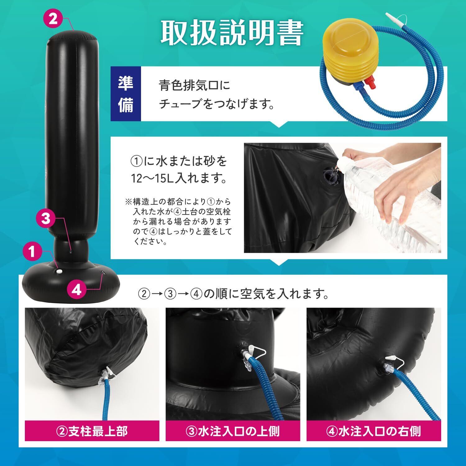 【エアポンプ付き】便利なエアポンプ付属でパッケージ後面にわかりやすいカラー日本語説明書を掲載しているので受け取ってすぐにご使用いただけます。組み立ては簡単!説明書の手順に沿って15分程度で完成します。