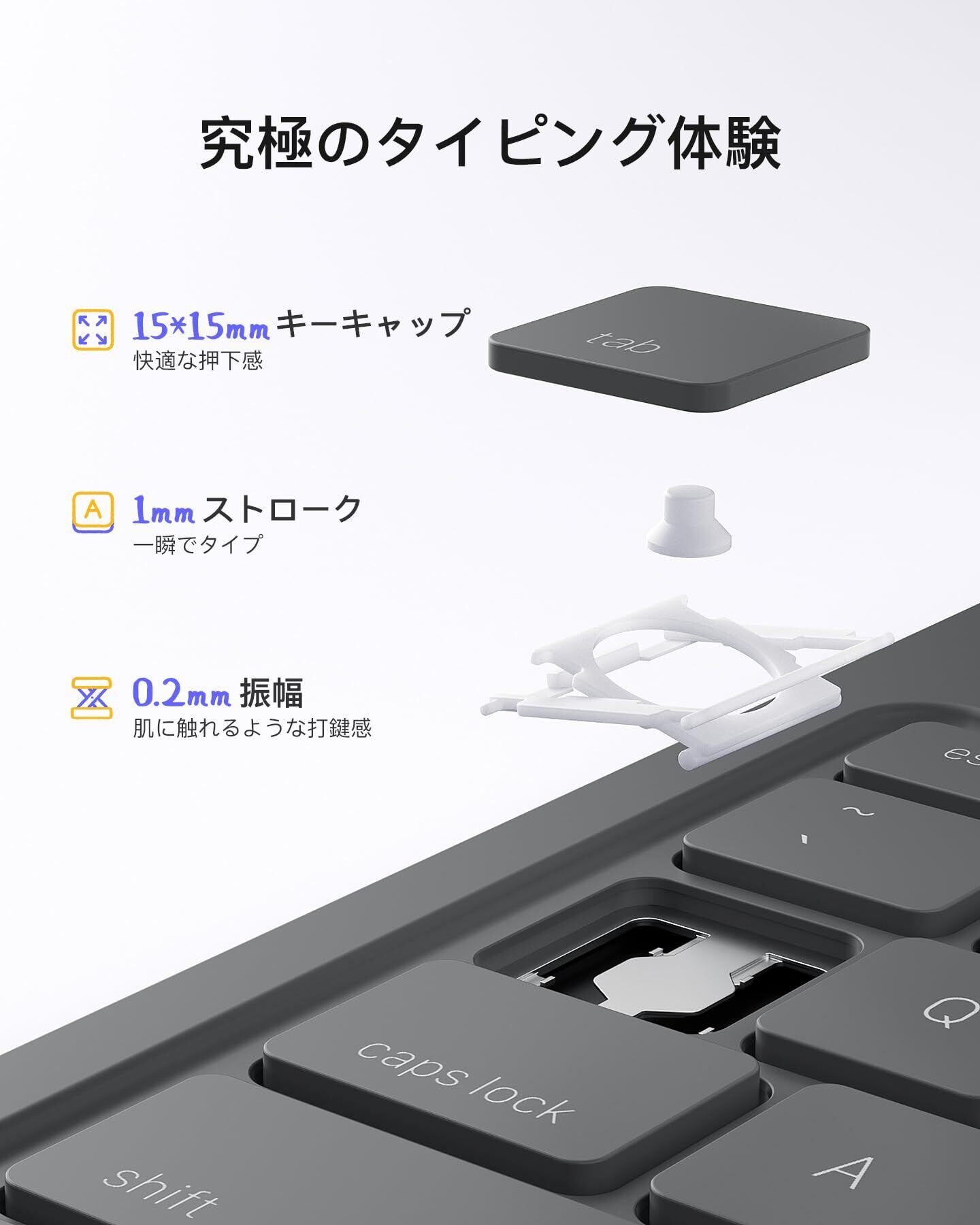 便利なショートカットキー:6行のキーで構成される革新的なキーボードは一番上の行が専用のショートカットキーです。ワンクリックで画面をロックしたり、音量を調節したりすることができ、複雑なキーコンビネーションを避けることもできます。15mm×15mmのキーは、ラップトップと同様の快適なタイピング体験を提供します