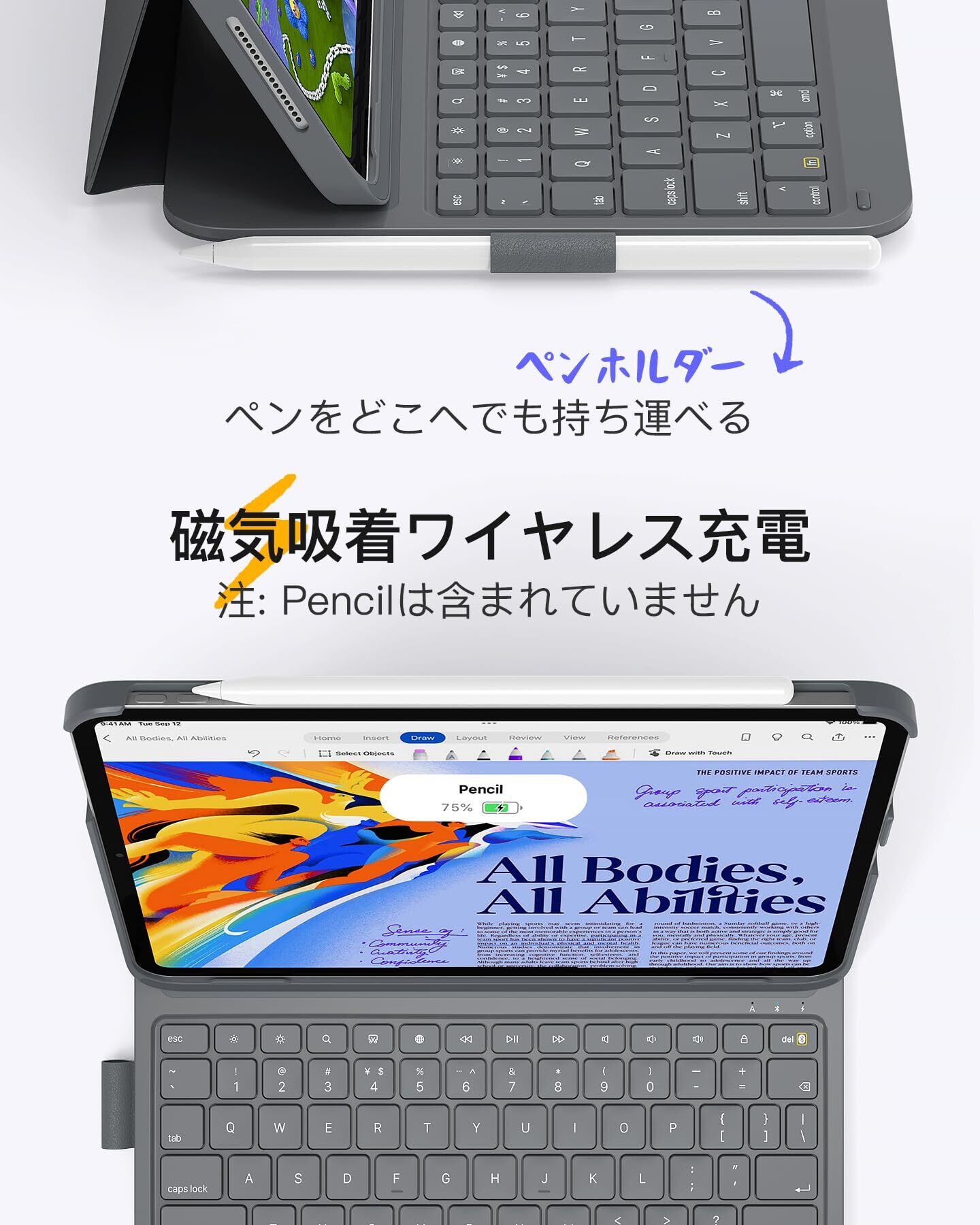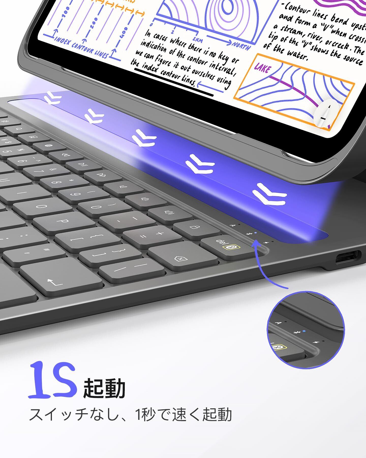 1秒起動:1秒未満でオンになります。iPadを立ち上げるとキーボードが自動的に電源が入ります。iPadを持ち上げるとキーボードの電源が自動的にオフになります。物理スイッチなしでより手間なく省電力です