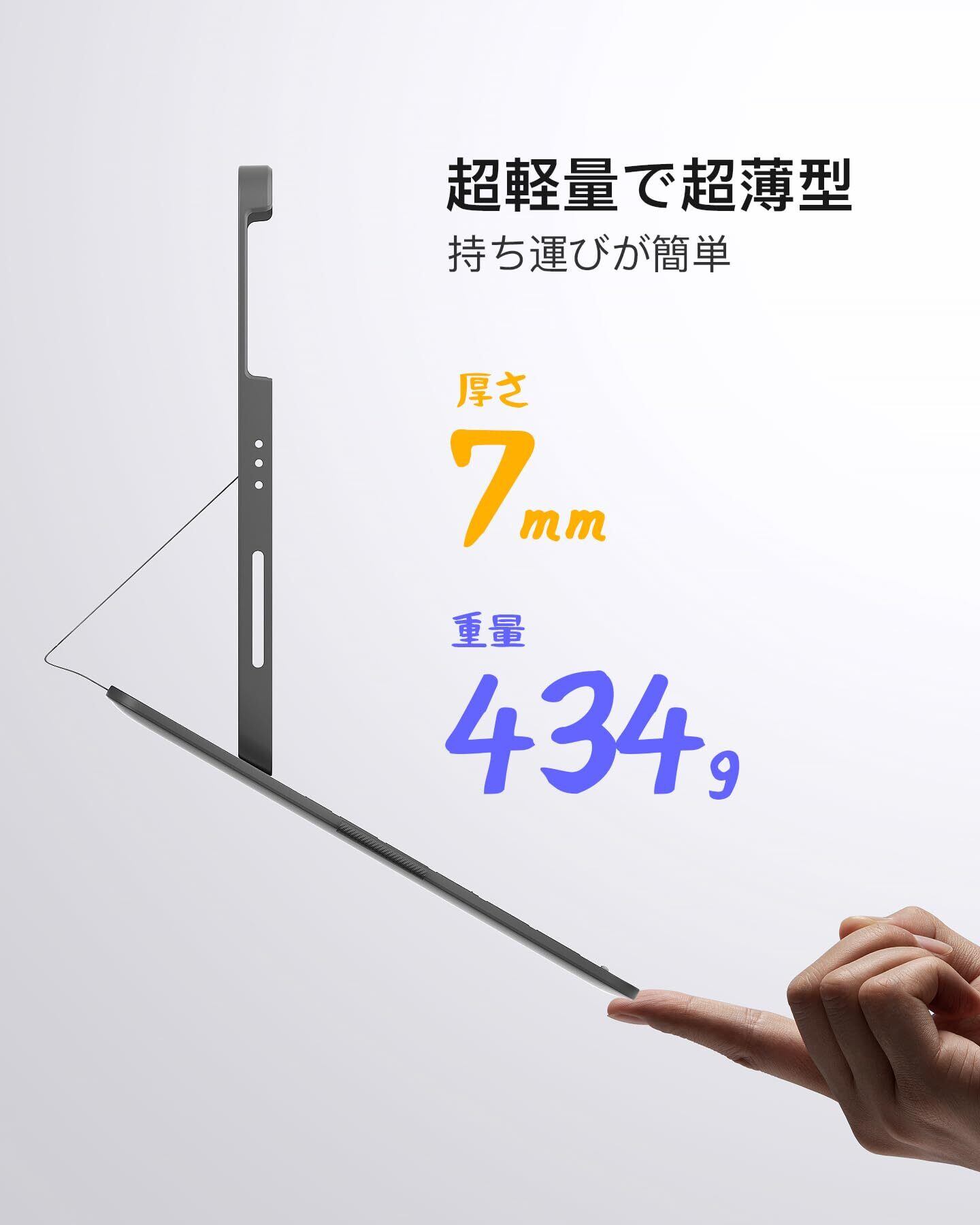 超薄型で超軽量:キーボードの厚さは0.7cmで、カバーで覆われているときが1.5cmです。全体の重量は434gで、類似製品の90%より軽量。より便利に持ち歩くための軽量設計です