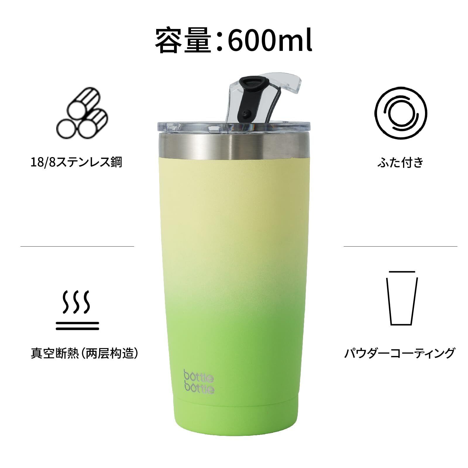 BOTTLE BOTTLE ステンレス タンブラー 600ml 蓋付き 溢れない 大容量水筒 二重構造 コーヒーボトル 真空断熱 保冷保温 ストロー 直飲み グリーン