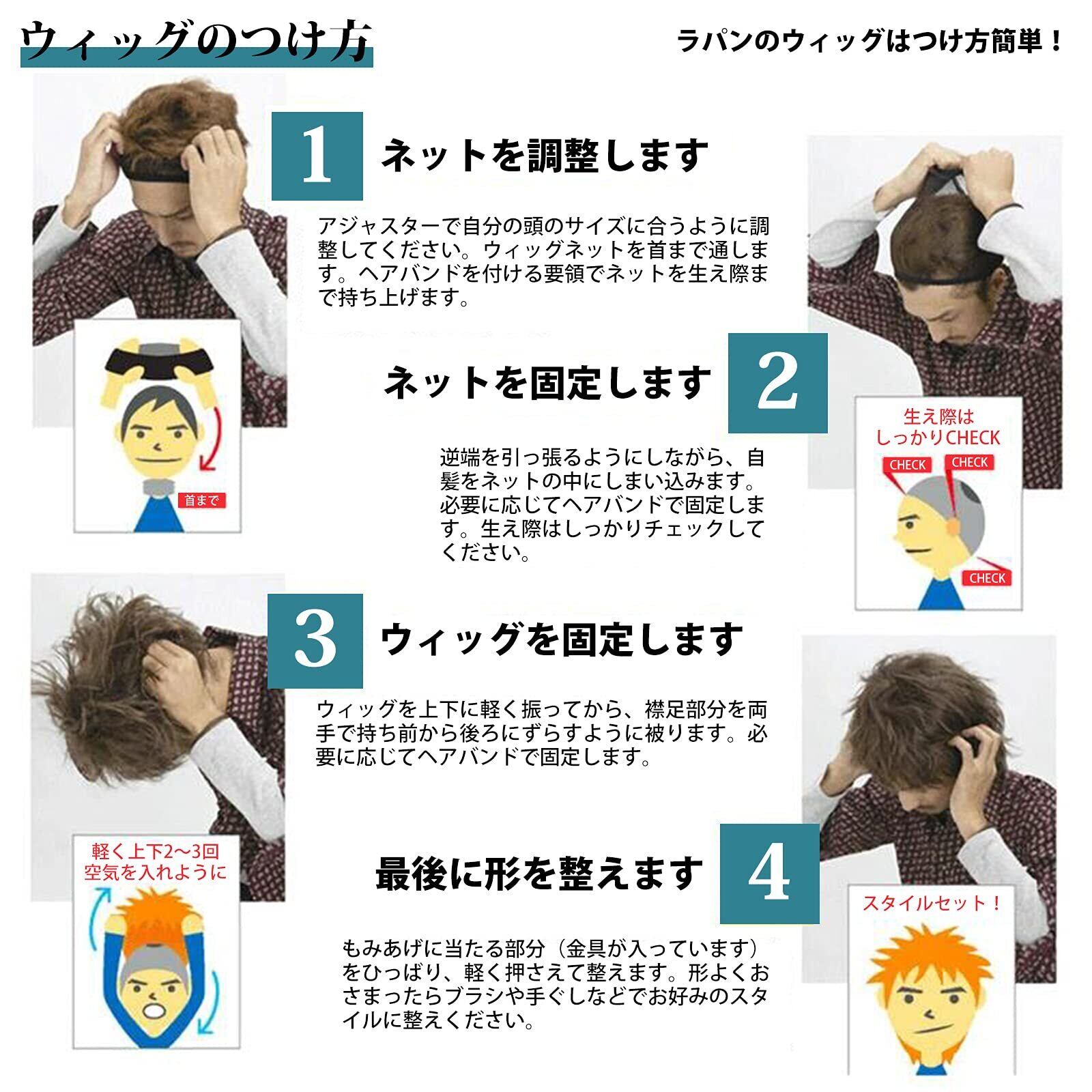 【ご使用上の注意】ウィッグは到着した際、左右に振り空気を入れてから被ると、ボリュームが出てより馴染みます。ご使用後は、ウィッグスタンドなどにかけ、火気ないところで保管し、汗などが乾燥してから袋に入れる保管方法をお願いします。水洗い可能ですが、長時間水の中に放置したりしないでください。水洗いの際は、服用のネットなどに入れて揉むように洗うことをオススメします。水洗い後のドライヤーは、スタンドなどにかけて、一点に集中せず乾燥してください。