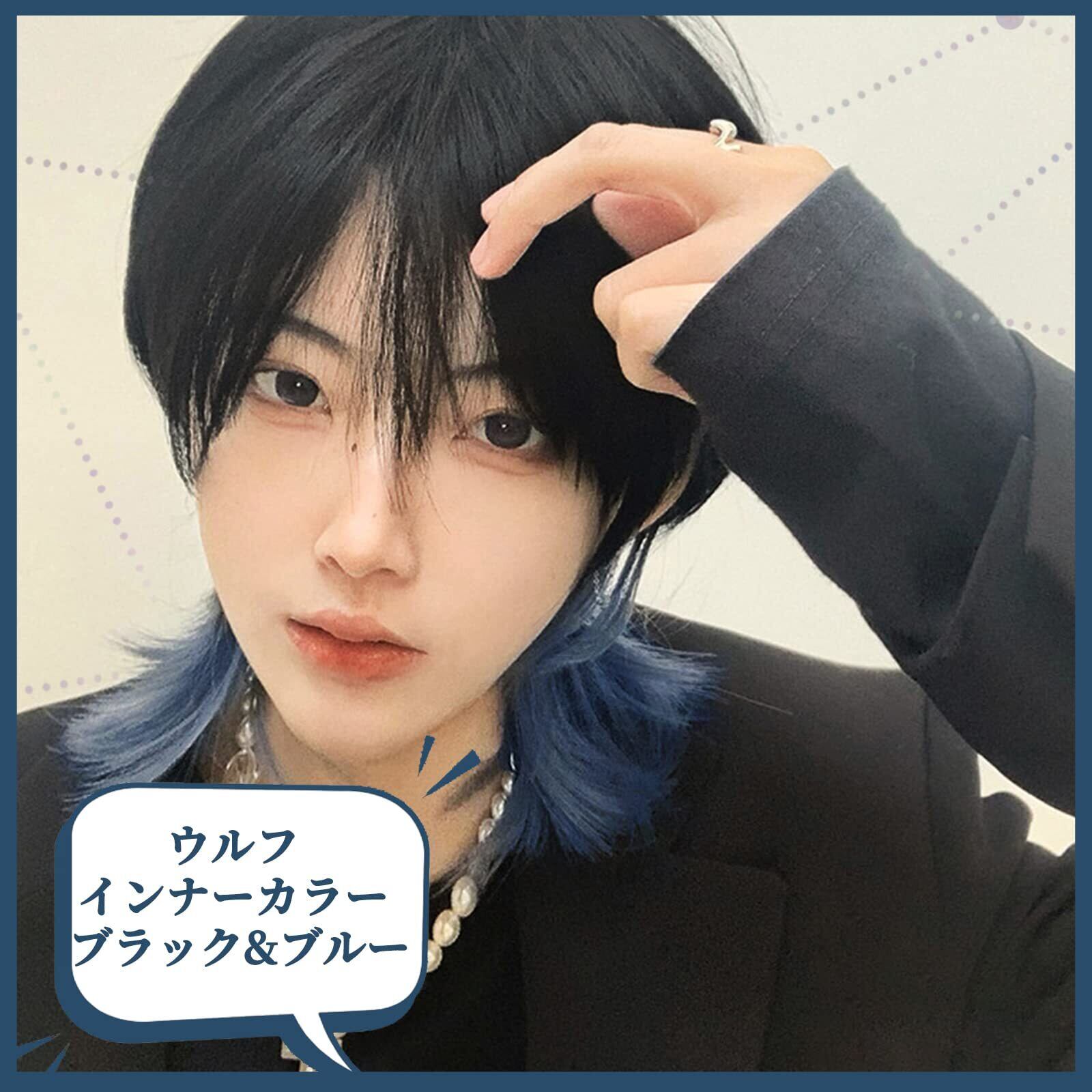 FESHFEN 人工毛 ウィッグ メンズ かつら ショート ウルフ インナーカラー フルウィッグ 男装 黒 男性 原宿 イケメン ハンサム 自然 小顔 耐熱 人気 ファッション イメチェン 男女兼用 短髪 ネット/櫛付き ウルフーブルー
