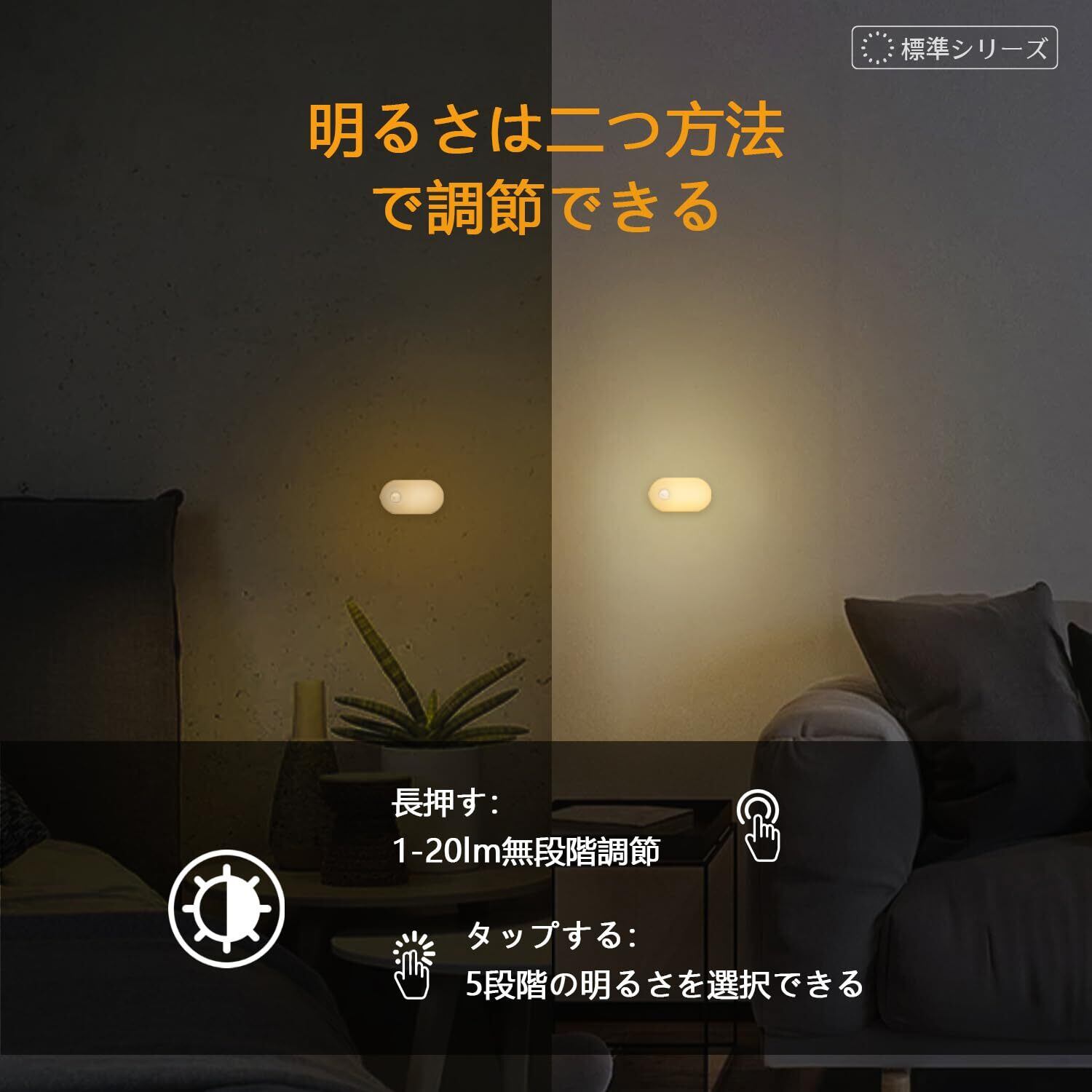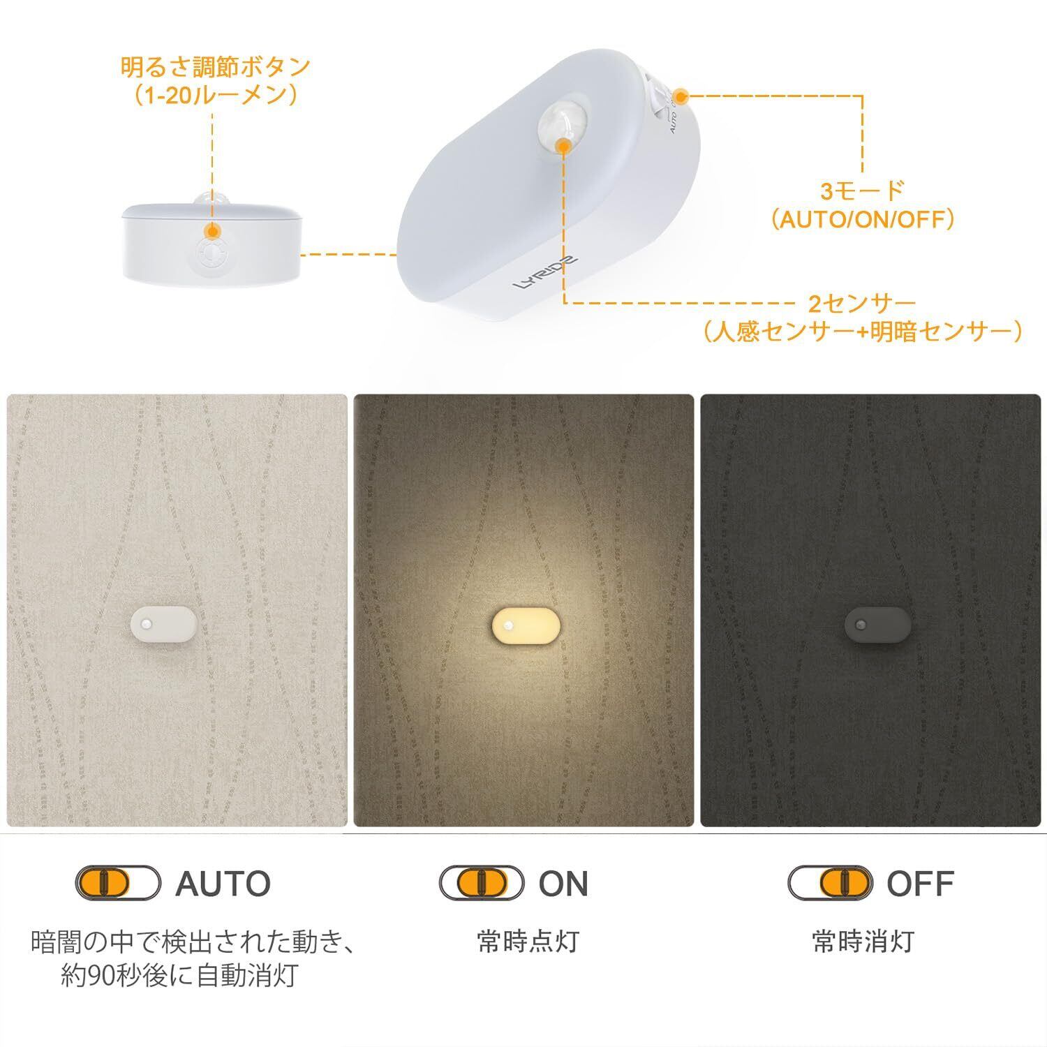 Lyridz LEDセンサーライト 人感センサー 足元灯 usb充電式 足元ライト 人感 ナイトライト 無段階明るさ調節 3つのモード 電球色 省エネ 廊下 寝室 玄関 階段 【2個セット·日本語取説】