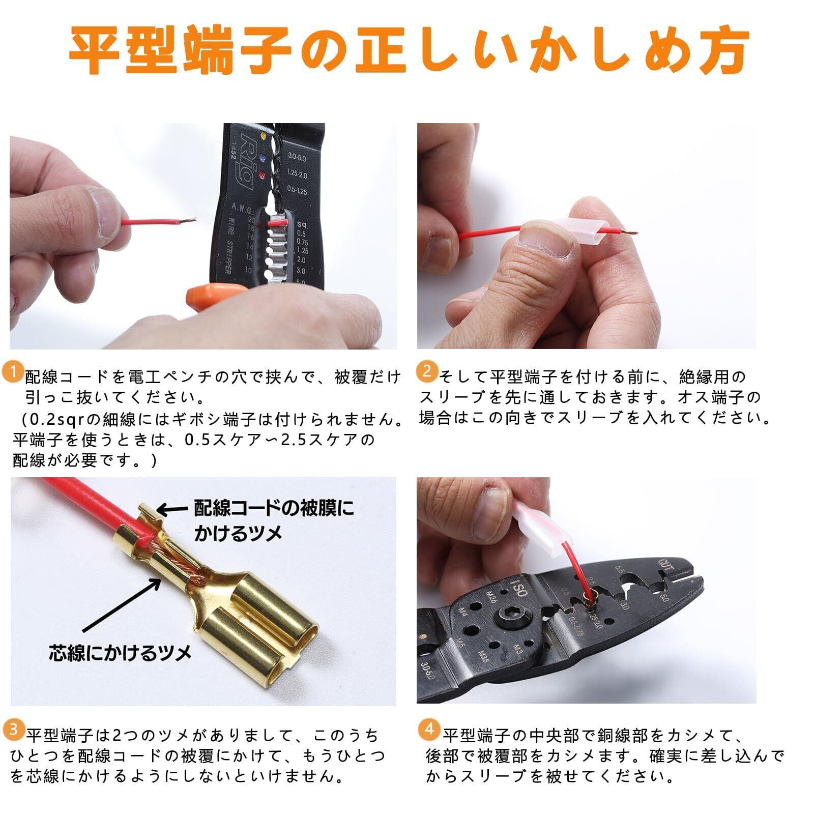 【使用簡単】まず、絶縁スリーブを電線に接続し、次にケーブルの両端にメスとオスの平型端子を繋げて組み合わせて使います。ご注意:専用の電工ペンチを使用して配線コードの接続を行います。