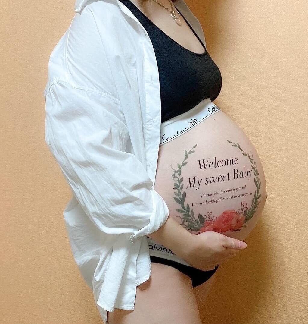 貼り付けに時間がかからず簡単にマタニティフォトが撮影できます。 落とすのも簡単で時間はかかりません。 ボディペイントよりも早く簡単に利用することができます。