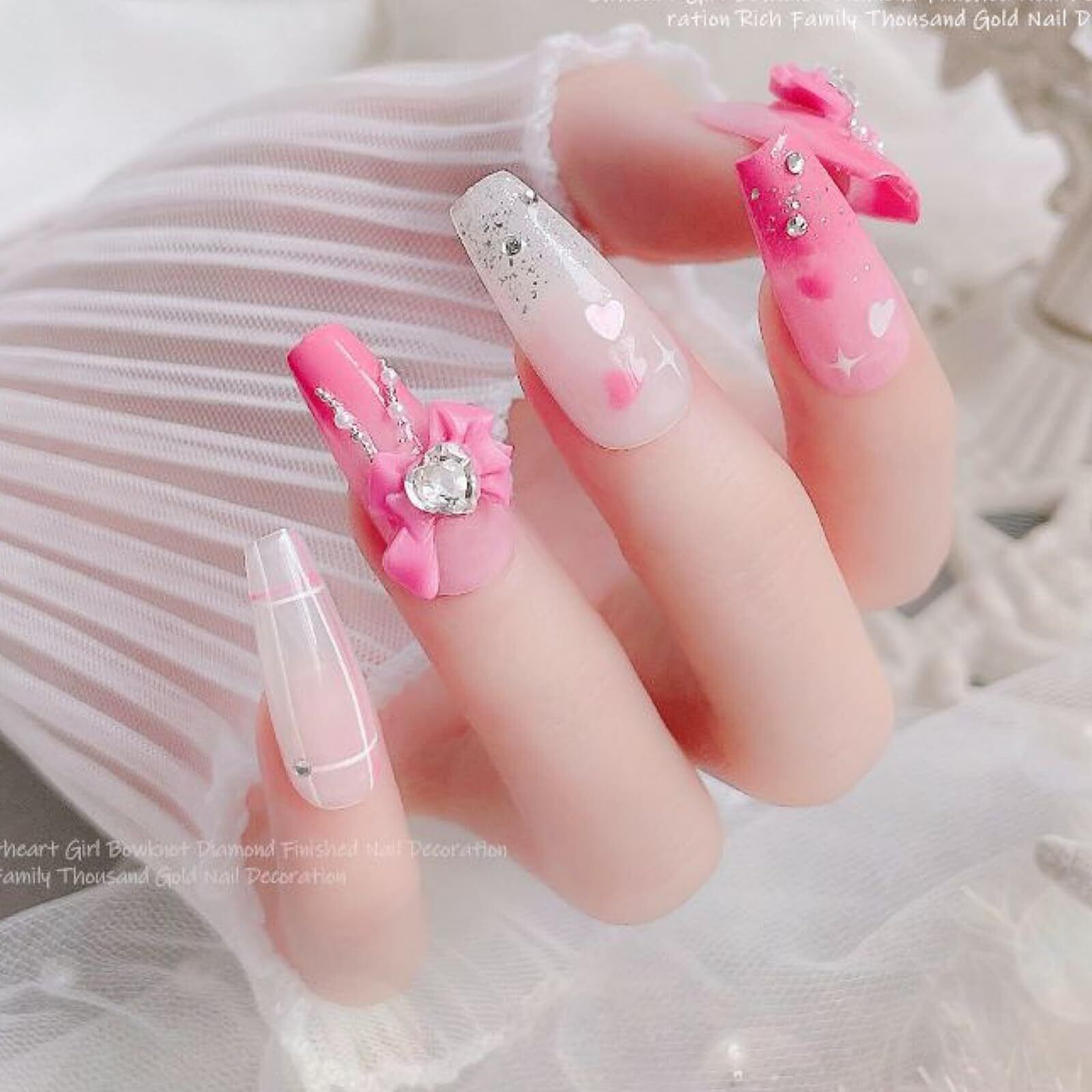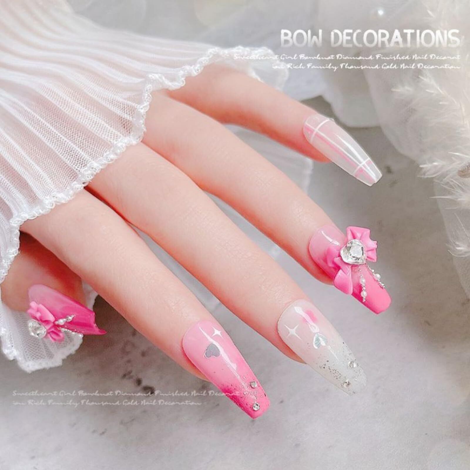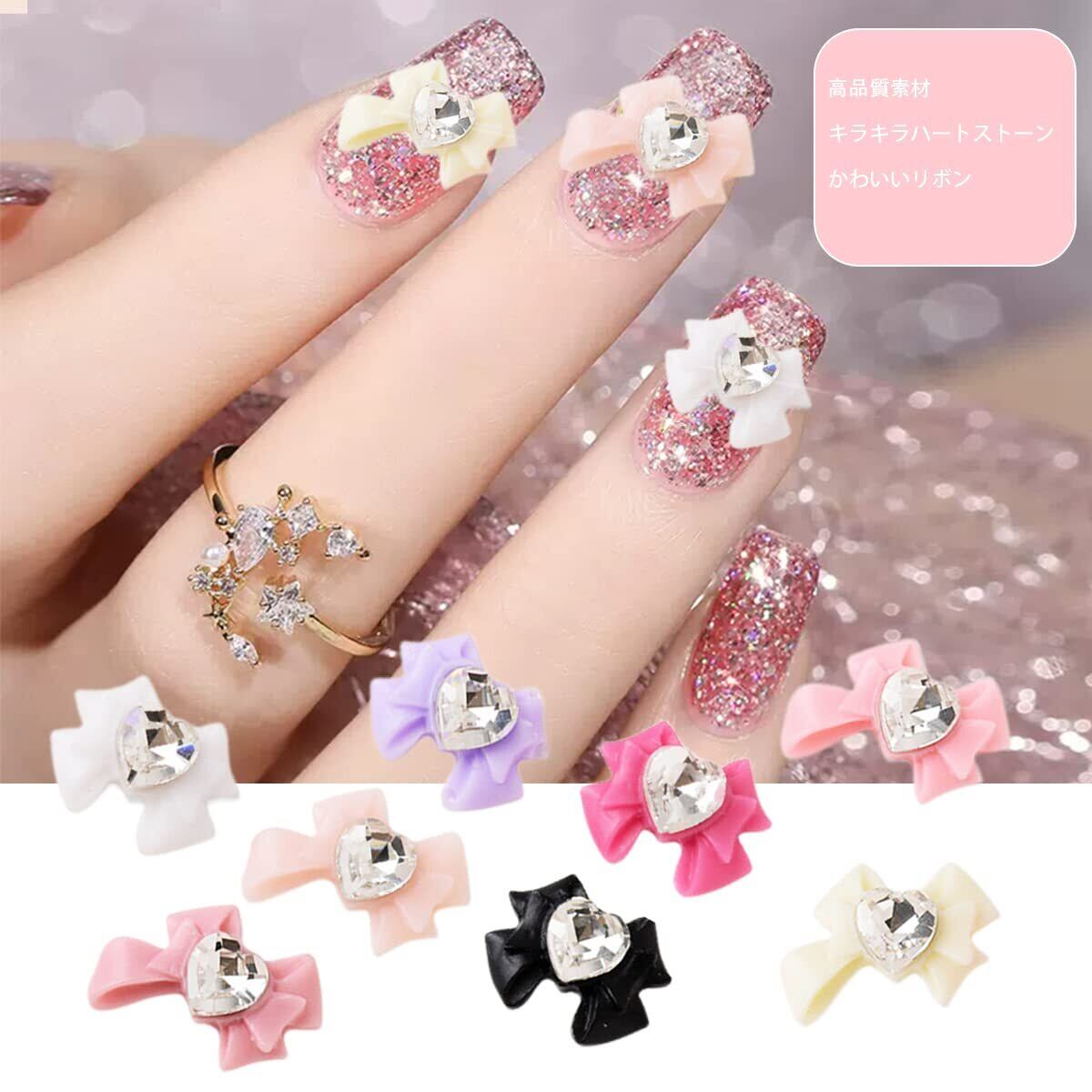 【リボンネイルパーツ】色が豊富なネイルリボンパーツです。2種類デザインのリボンがあり、キラキラしているハートストーンもちりばめられていて、とても綺麗です。