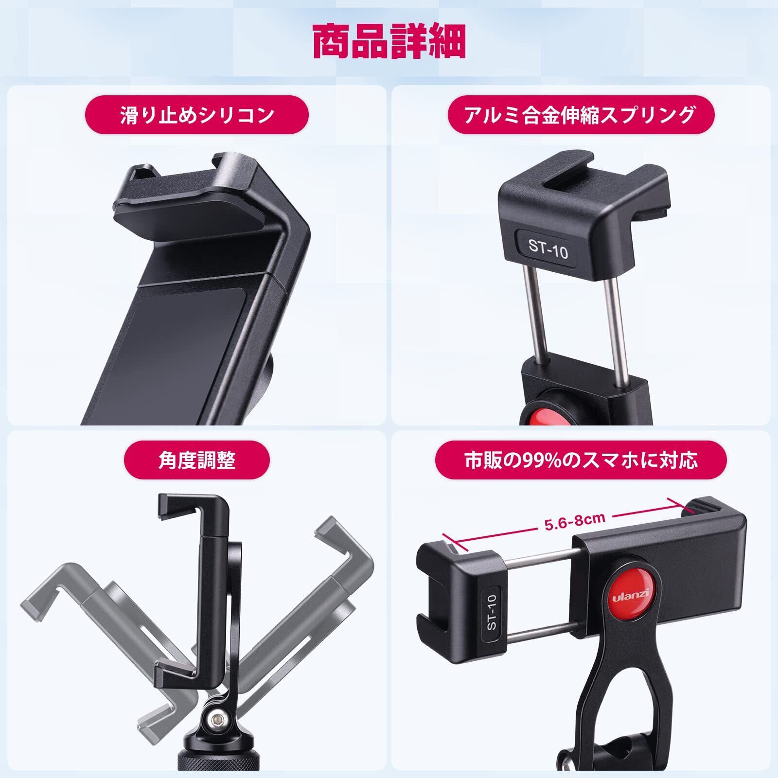 コールドシューマウント--- ST-10スマホスタンドには、ユニークなコールドシューマウントデザインにより、マイク、ビデオライト、その他の機器を固定できるスマホ三脚マウントです。