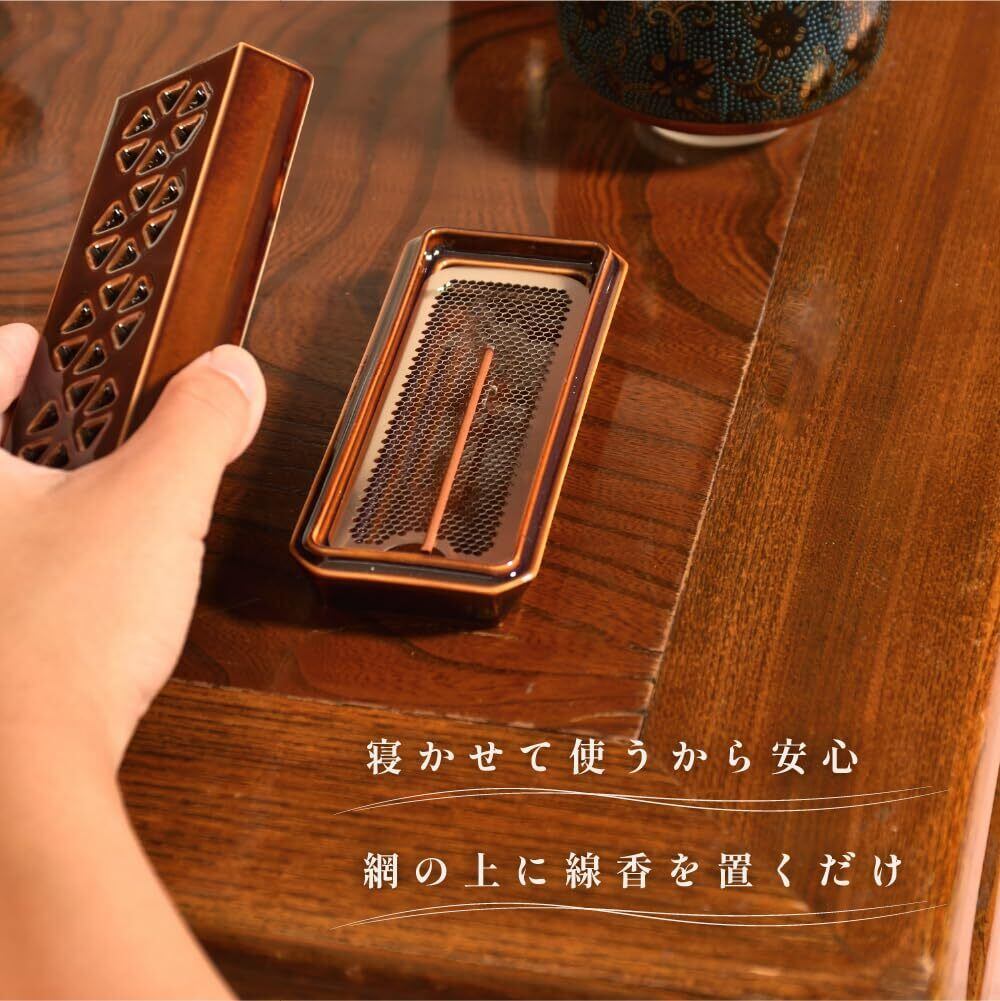 香炉灰をなくし、独自製法の網の上でお線香を寝かせて燃焼させることにより、灰が飛び散らない安全性とお手入れのしやすさを両立しました。火気があると不安な寝室や賃貸のお部屋、小さなお子様などがいるご家庭でも気軽にご使用いただけます。お手入れのしやすさやおしゃれな見た目は、初めて線香皿をご購入される方にもおすすめです。